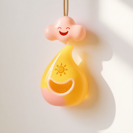 Промт 2: A wide horizontal ultra-high-resolution photograph of a «Laughter Catcher» hanging from a small nail on a warm off-white matte wall, consisting of a single organic jelly-like form in vibrant sun-yellow (
