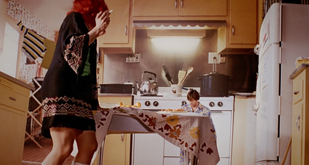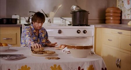 В кухонных сценах Гондри буквально перезаписывает память: Клементина «встраивается» в детское воспоминание вместо матери, но композиция остаётся той же — маленький Джоэл за большим столом, громоздкая кухня, светлые тёплые цвета. Масштаб и ракурс подчёркивают его детскую уязвимость: взрослое тело Клем становится частью старой сцены стыда и одиночества, но теперь она не ругает, а подыгрывает ему.