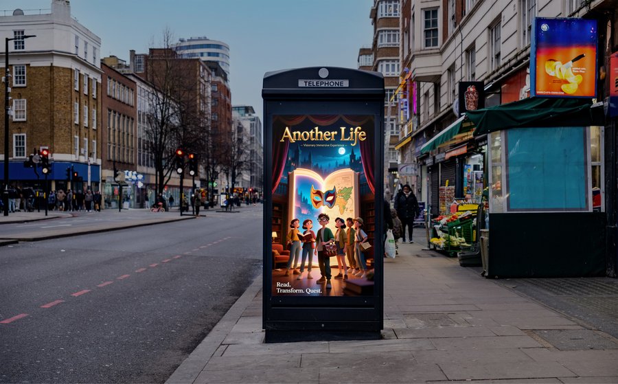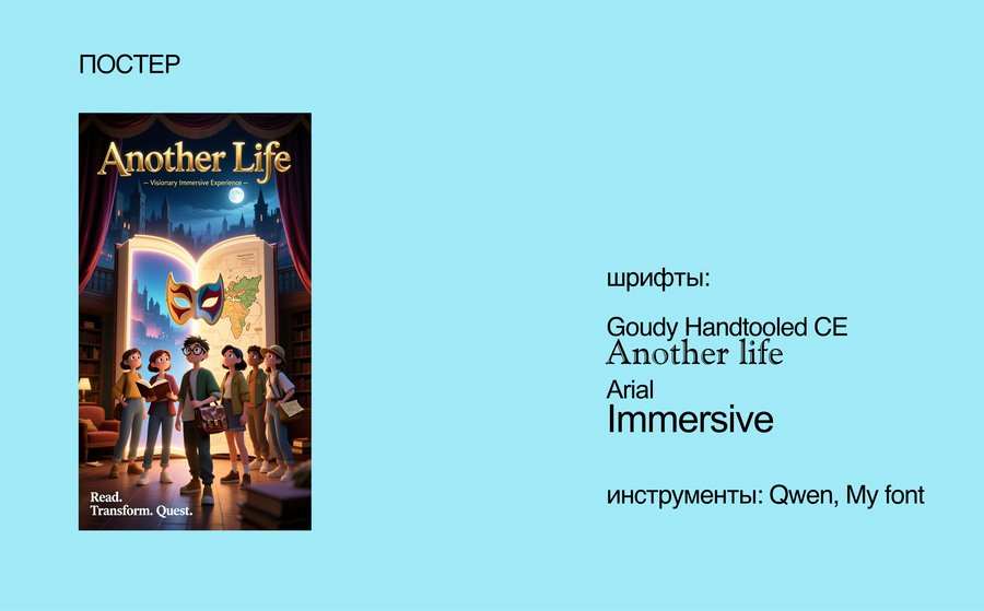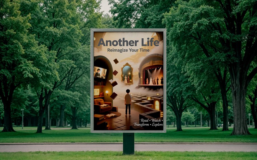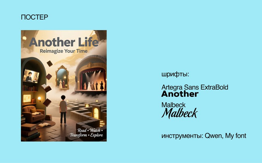 Промт: make a poster as a merch of the cultural center. My project is the cultural center «Another life», which combines 3 ways to spend time: