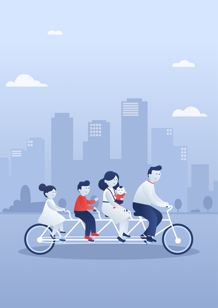 Иллюстрация представляет образ семьи как движущей силы демографического развития страны. Семья в полном составе: отец, мать с младенцем, сын и дочь, едут на одном длинном велосипеде, символизируя единство, согласованность и общую цель. Каждый член семьи включен в движение по-своему, но они двигаются синхронно: это метафора преемственности поколений и общего направления, в котором развивается общество.