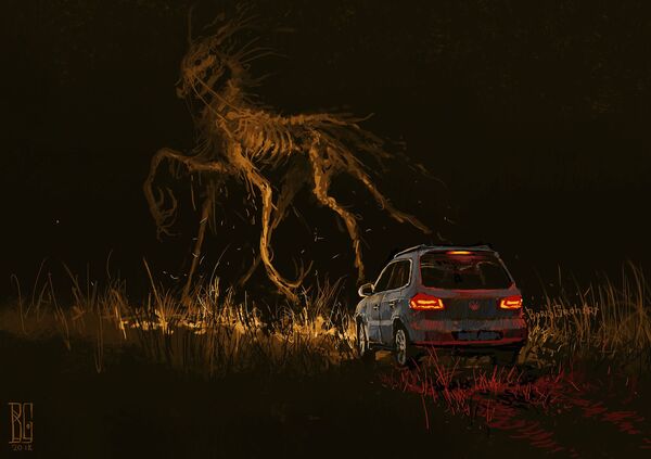Почти постоянными «гостями» на его картинах становятся нереальные существа пугающих размеров, порой взаимодействующие с людьми, а порой и просто вписывающиеся в привычный нам окружающий мир так, словно это обыденность.