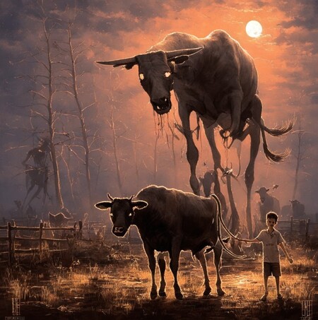 На сгенерированных нейросетью изображениях сохранилась присущая Борису Гроху живописность: местами можно разглядеть отдельные характерные мазки. Сохранились и общие мотивы работ с большими существами, а помимо них и общая стилистика оформления освещения и цветовых палитр.