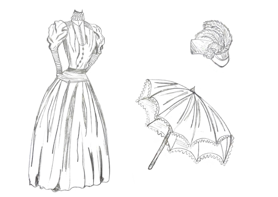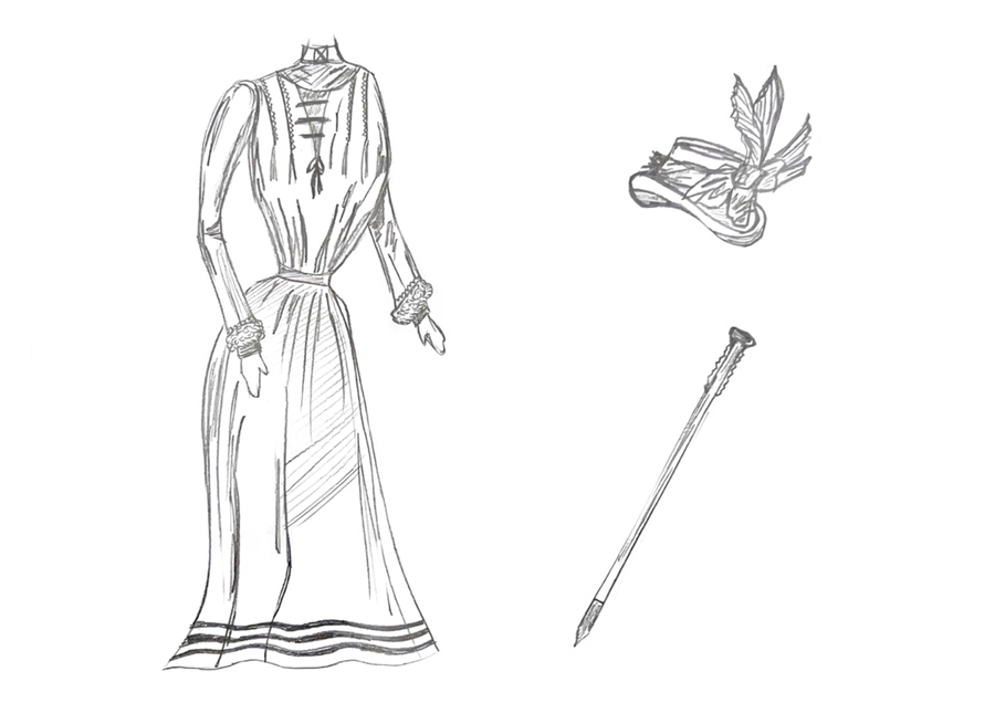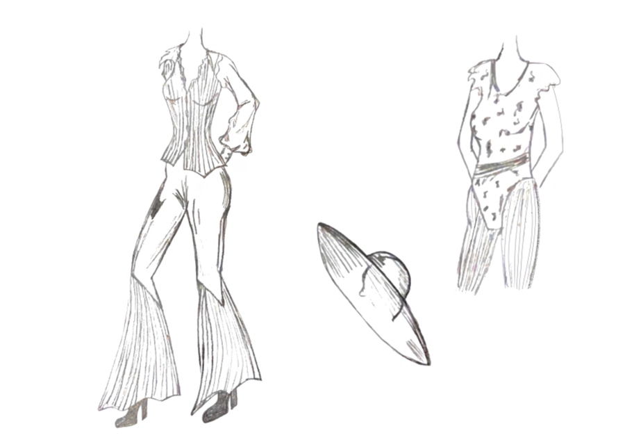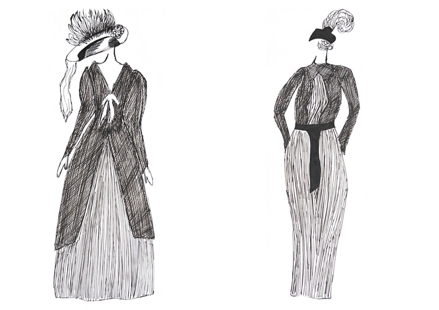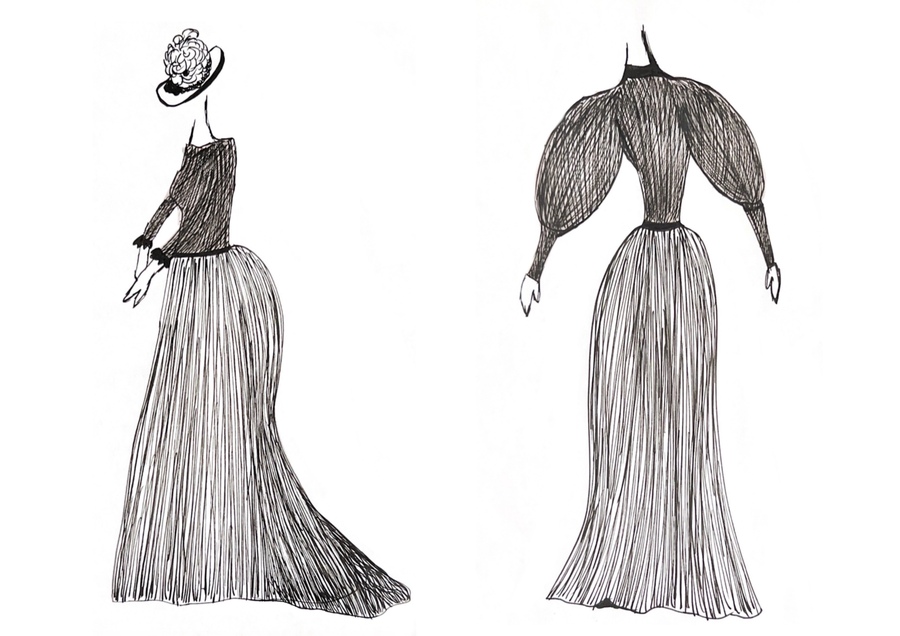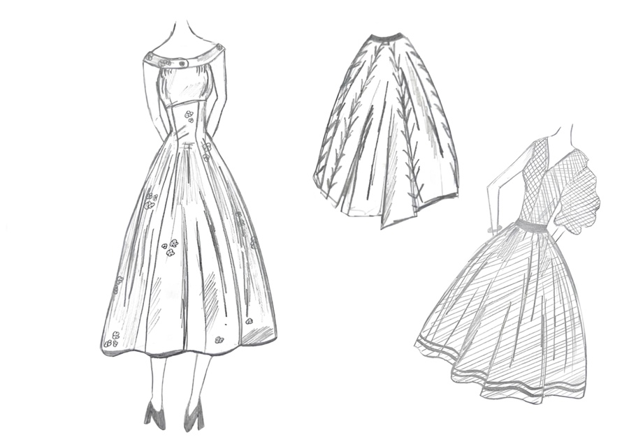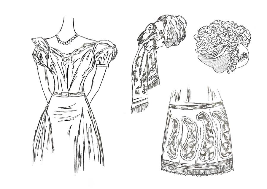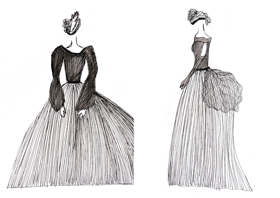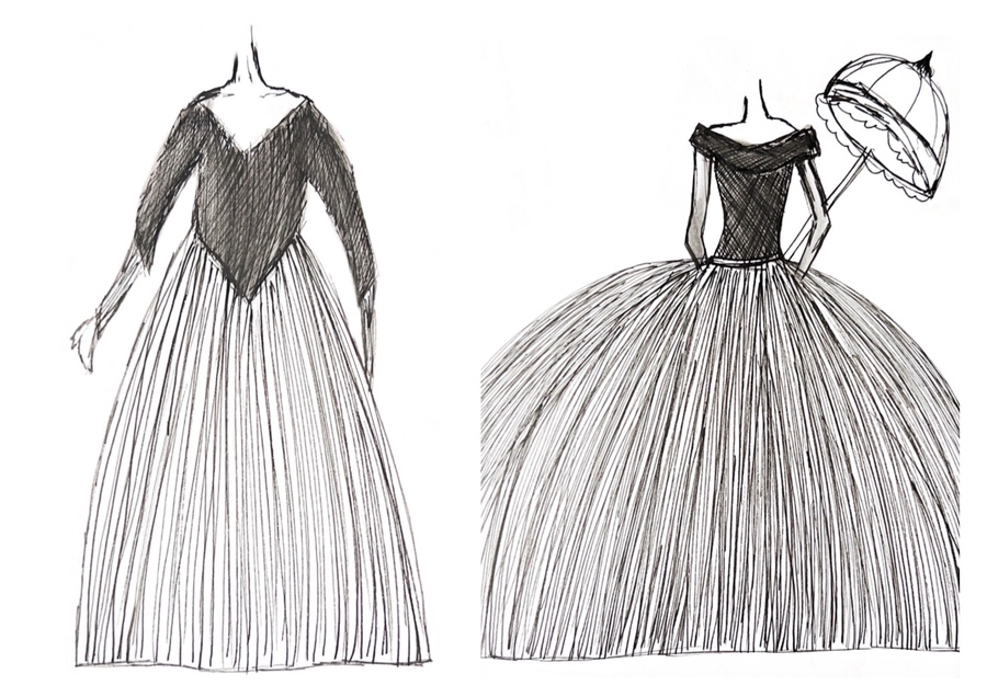 1-й блок направлен на изучение и прорисовку костюма или предмета костюма по КП в различных графических приемах, стилях, идеях