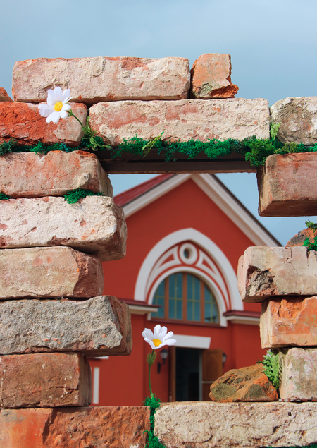 Арт-объект для выставки «Ферма» в Царском Селе. Проект об истории императорской фермы, о ее прошлом. Стена построена из старых кирпичей фермы, а пробивающиеся через них растения — символ новой жизни и ее будущего. Дыра в стене становится окном, через которое видно нынешнее здание фермы.