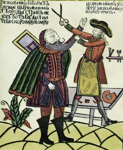 (слева) Офицерский парикмахер, 1908, Михаил Ларионов (справа) Раскольник и цирюльник, 1770-е, Лубок, Анонимный автор