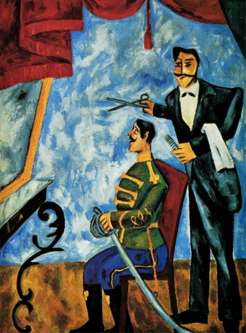 В работе «Офицерский парикмахер» Ларионова ярко прослеживается влияние народного лубка, с его примитивностью как в сюжете, так и художественных приемах, цветах и работе в одной плоскости. При этом в отличие от большинства художников этого круга, Попова воспринимает неопримитивизм скорее как отправную точку для дальнейшего творчества. Уже в этих ранних работах заметно, что её внимание сосредоточено не столько на наивной декоративности, сколько на построении живописного пространства и ритма, что станет особенно значимо в последующих кубофутуристических композициях.