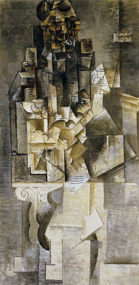 Например, Пикассо немного раньше пишет картину «мужчина с гитарой», где мы также можем наблюдать едва узнаваемый силуэт человека, созданный с помощью наслоения большого количества геометрических форм, пересекающихся под разными углами в разных плоскостях. Отличить силуэт гитары от человека позволяет добавление светлых цветовых элементов. Если верхняя половина человека и фона на картине написаны темными, глубокими, иногда почти черным цветами, то силуэт гитары светлый, в некоторых местах почти белого цвета. Сам музыкальный инструмент также отображен лишь формально и состоит из фигур в разных плоскостях.