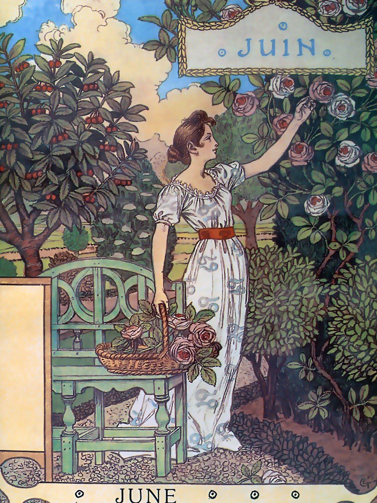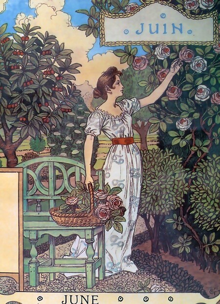 Эжен Грассе стал ключевой фигурой в создании плакатов в стиле ар-нуво. В его иллюстрациях для календаря заметна характерная природность и естественность ар-нуво, а изображения растительности стилизованы и при этом детализированы, подписи декорированы узорами.