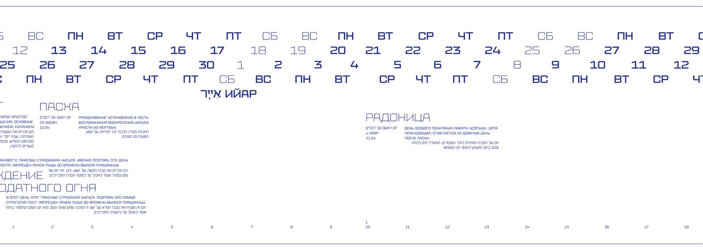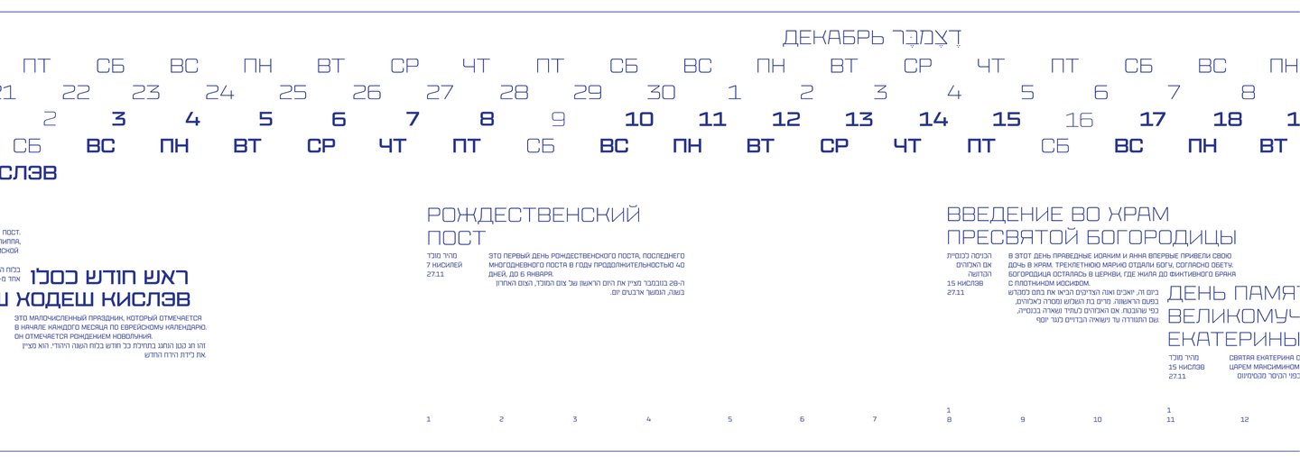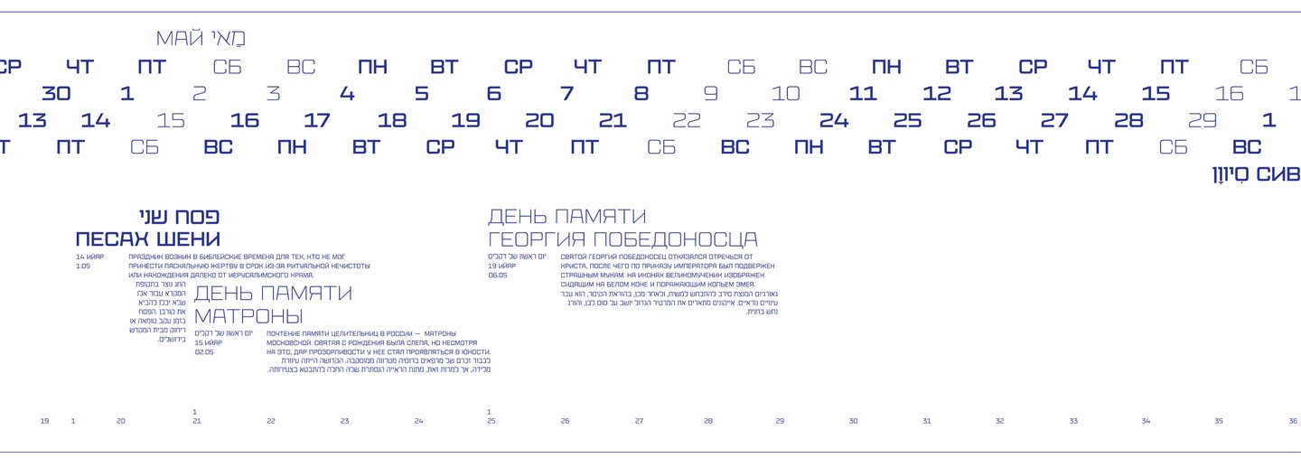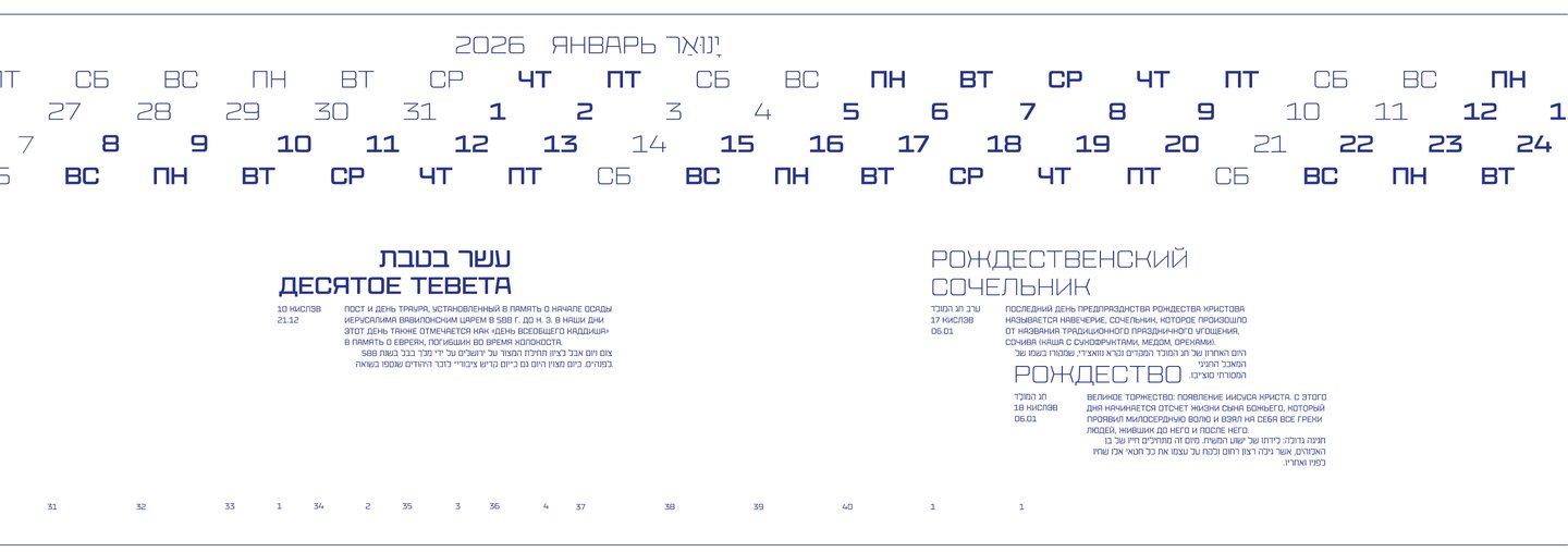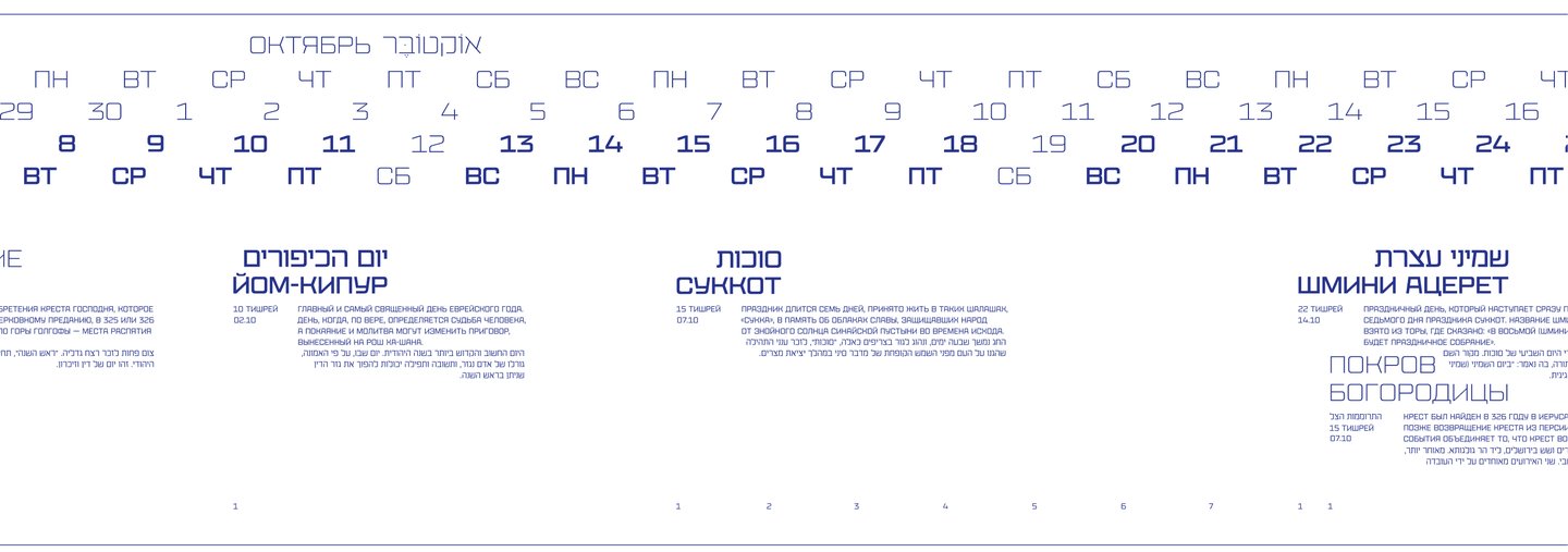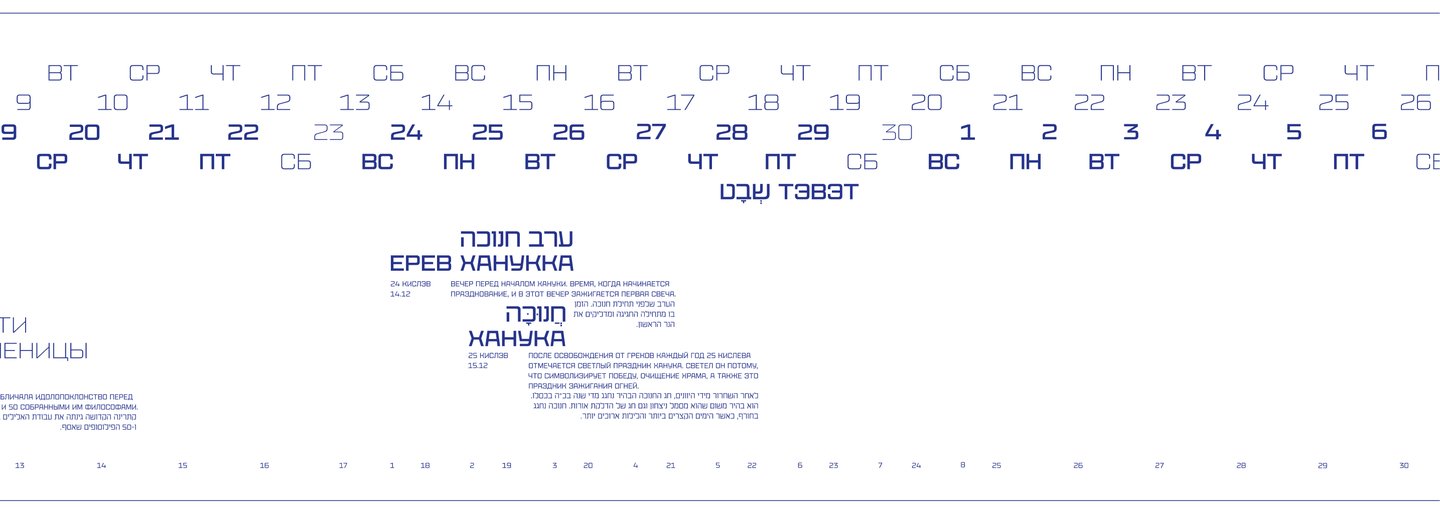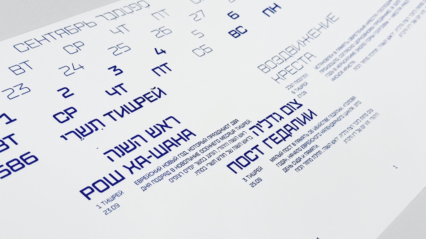 Календарь рассказывает о двух разных культурах и совмещает два времени: иудейское и григорианское.