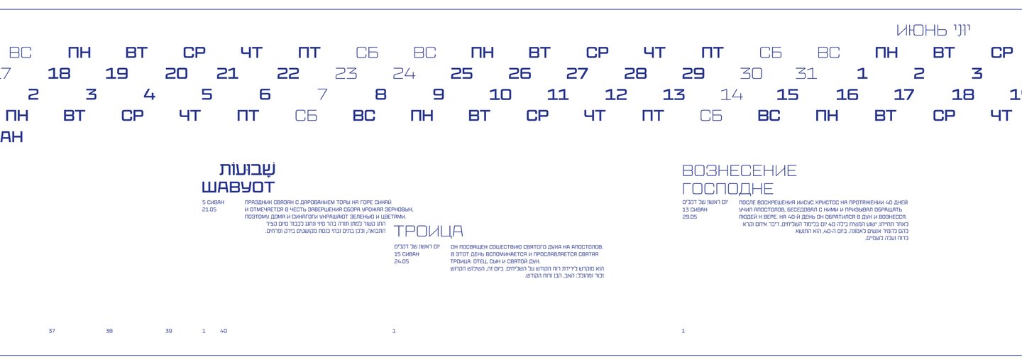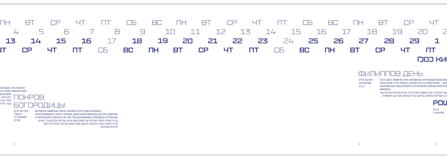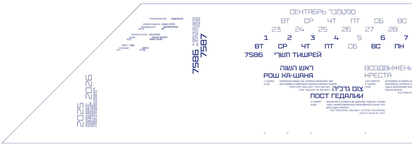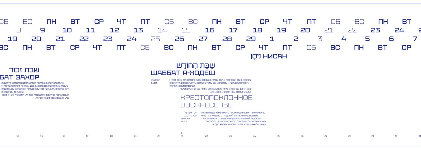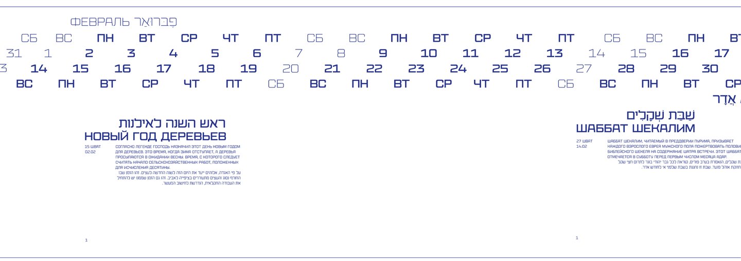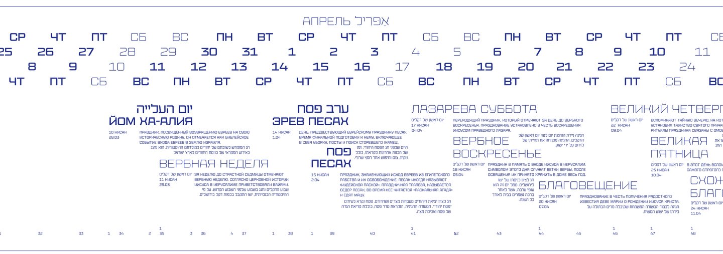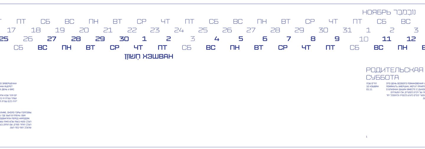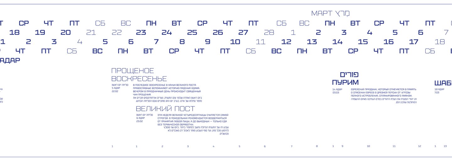 Календарь рассказывает о двух разных культурах и совмещает два времени: иудейское и григорианское.