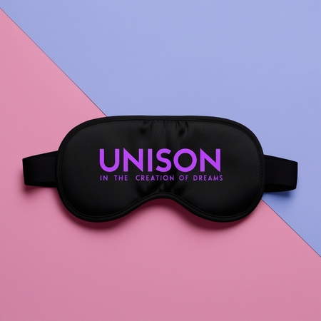 «make a sleep mask in the style of the company „UNISON“, which is engaged in the creation of dreams. the mask should be in black color, on the mask should be written the logo of the company in purple colors, and the background monotonous in pink, purple and blue colors»