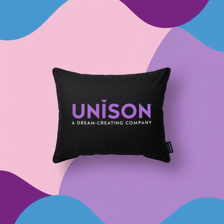 «make a pillow in the style of UNISON, a dream-creating company. The pillow should be in black color, the company logo should be written on the pillow in purple colors, and the background should be monotonous in pink, purple and blue colors»
