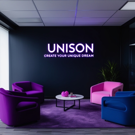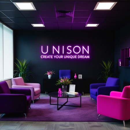 «office space of UNISON company, which is engaged in dream creation. dark colors should prevail in the office, and in the center on the wall there should be a sign with the UNISON logo and the slogan „create your unique dream“. The inscriptions should glow with neon purple colors. The furniture in the office should also be purple, pink and blue colors»
