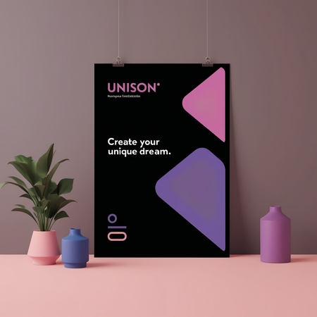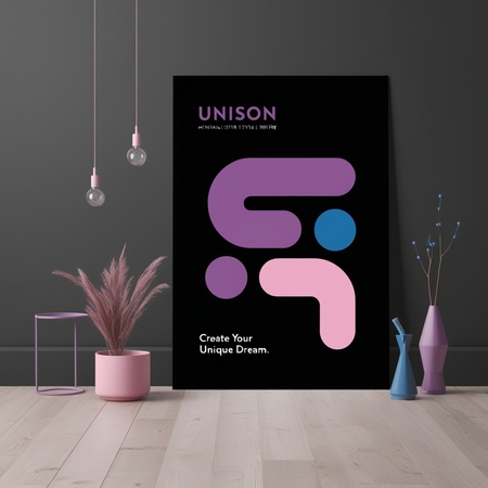 Промт: «minimalistic and stylish advertising poster for the company „UNISON“ with the slogan „create your unique dream“. the background of the poster should be black, the company logo in purple colors, and minimalistic elements on the poster in pink, purple and blue colors.»