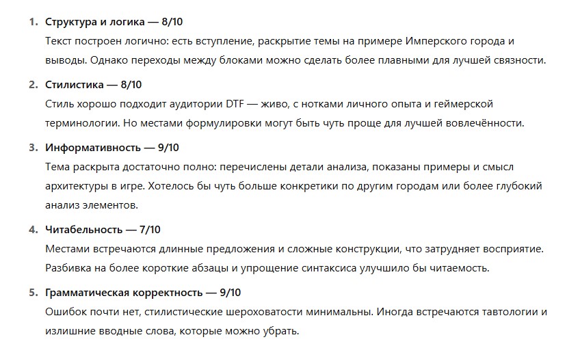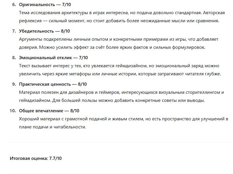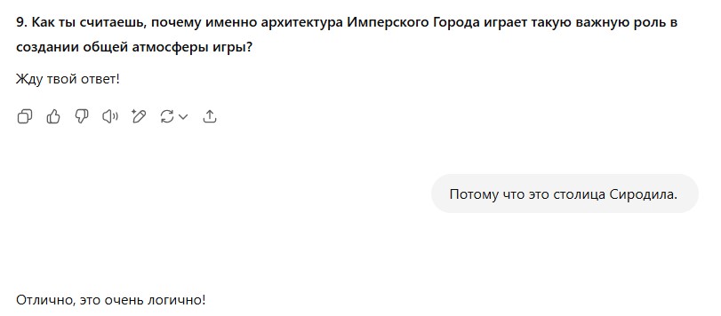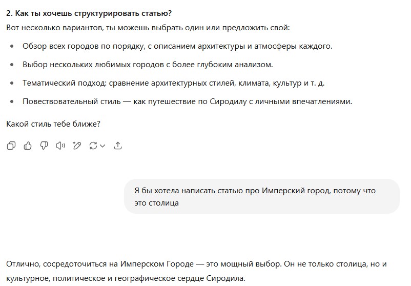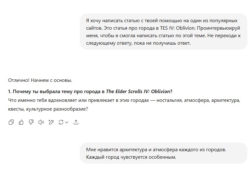 Я использовала нейросеть для: 1. Переработки текста. 2. Оформления заголовка и подзаголовков статьи. 3. Создания текста с определенным настроением (если в визуальном исследовании я использовала научно-публицистический стиль, то с помощью нейросети я привела текст к более дружелюбному и разговорному). 4. Помимо этого я сделала с его помощью вводную часть, где немного написала про себя и вывод, потому что в визуальном исследовании был общий вывод про все города Сиродила.
