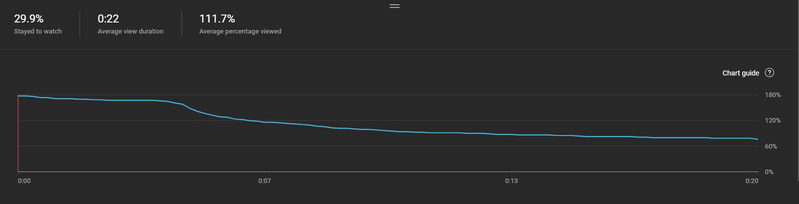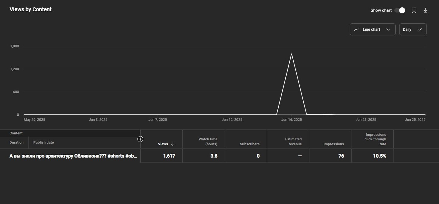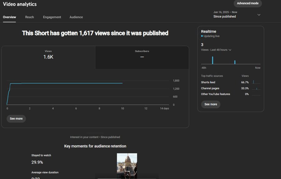 1. Ролик в первые дни набрал больше 1600 просмотров и несколько лайков. 2. Также он получил несколько лайков. 3. Углублённая вовлечённость аудитории низкая: суммарное время просмотра составляет 3.6 часа, что в среднем даёт около 8 секунд на просмотр, что типично для коротких видео, но свидетельствует о слабом удержании внимания.