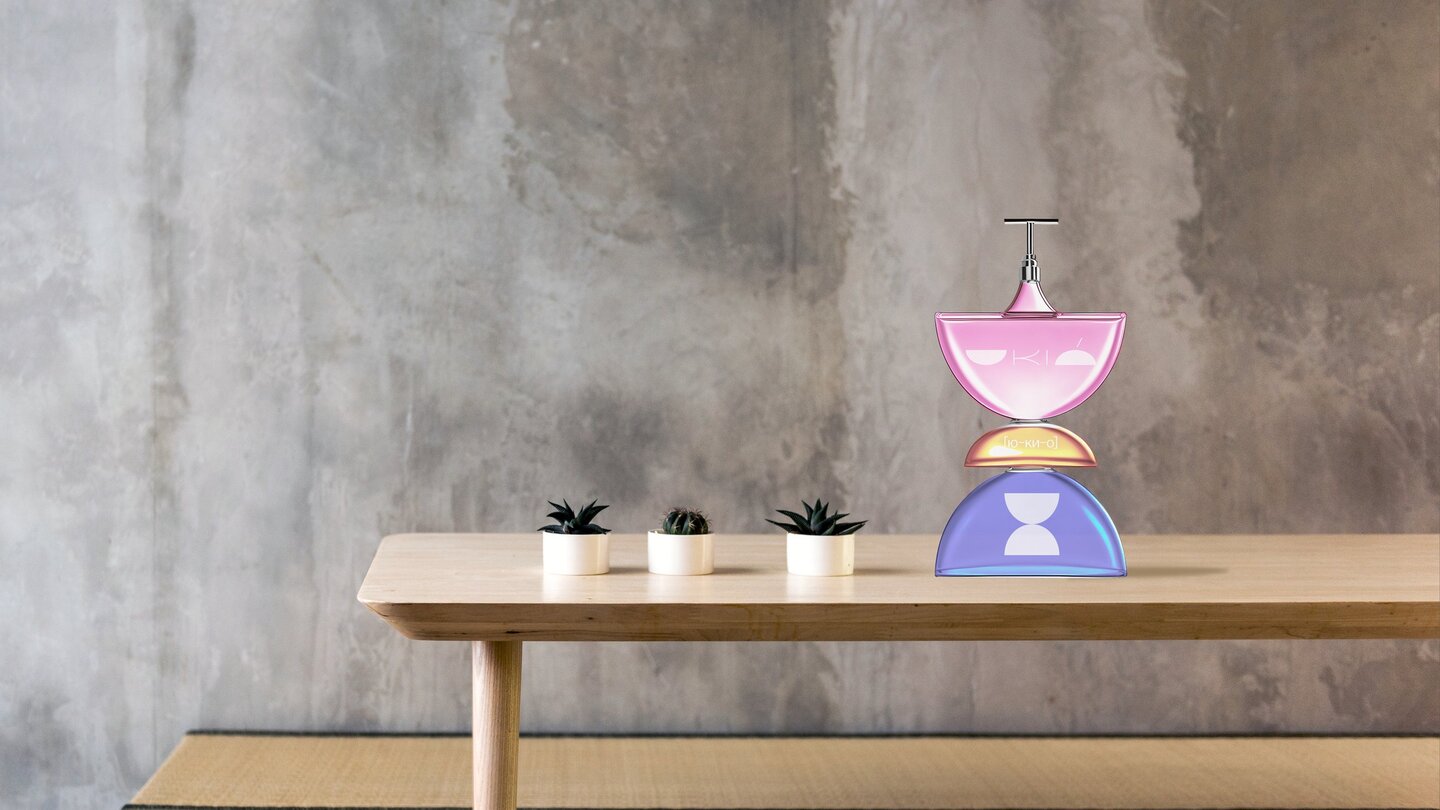 prompt: Create an image of a person in UKIO uniform (with 'UKIO' written on it) holding natural oil. Show them holding stackable, interlocking glass jar in soft colors (purple, yellow, blue, neutral tones) arranged neatly together, highlighting their unique design and ability to be assembled into creative shapes with the UKIO logo, surrounded by natural elements like plants, flowers, or essential oil ingredients. Use soft, harmonious colors (purple, yellow, blue, neutral tones) and ensure the scene reflects authenticity, sustainability, and premium quality