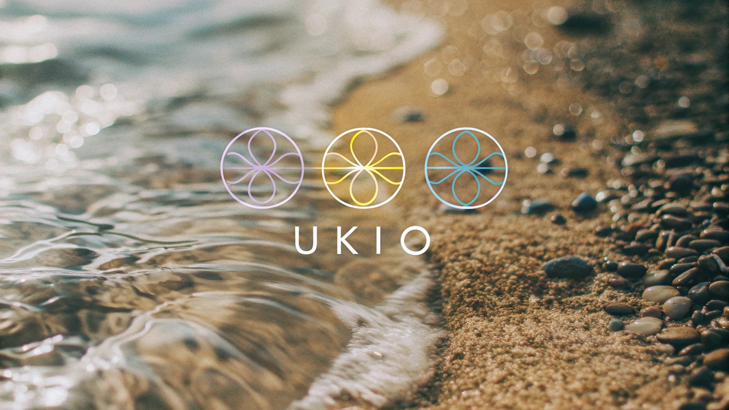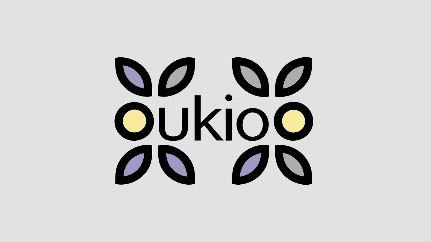 prompt: Create a modern, minimalist logo for a premium Vietnamese brand of natural aromatherapy oils called 'UKIO.' The logo should reflect harmony, nature, and creativity. Use soft, harmonious colors such as purple, yellow, blue, and neutral tones. Incorporate abstract geometric elements like circles, semicircles, or flowing lines to symbolize unity, time, and the connection between health and self-expression. The design should evoke calmness and balance while maintaining an elegant and contemporary aesthetic. Consider including a subtle reference to natural elements (e.g., sandalwood, trees, or essential oil droplets) without being overly literal. The final result should work well in both color and black-and-white formats and be versatile for use on packaging, digital platforms, and merchandise.