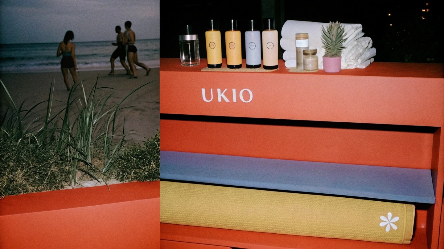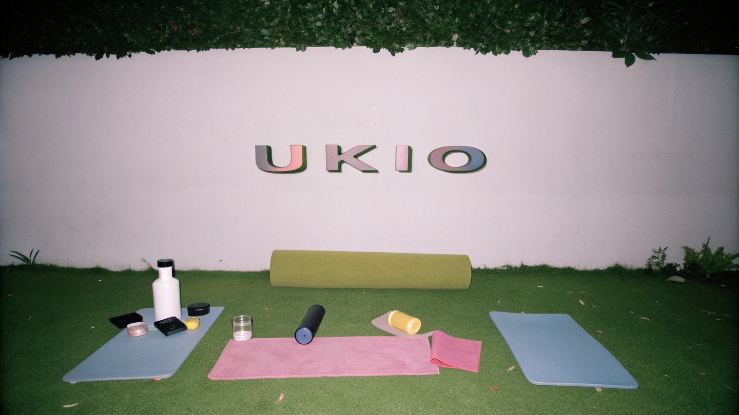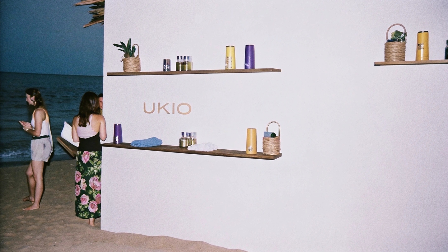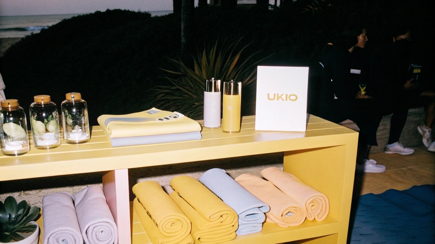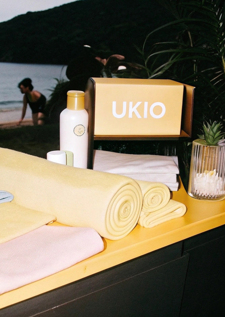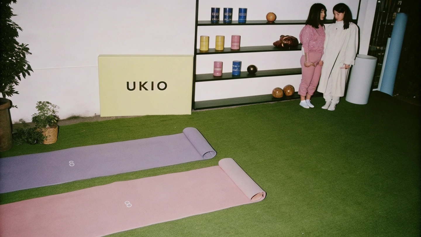 Prompt: Design a natural, premium indoors space by the sea for UKIO, faturing lush greenery and sleek shelving with glass il jars and branded products (yoga mats, sports papers, towels) in UKIO’s soft collor palette (purple, yellow, blue, neutral tones). Ensure all elements reflect the brandås minimalist, wellness-focused aesthetic. Include subtling with the UKIO log through the space.