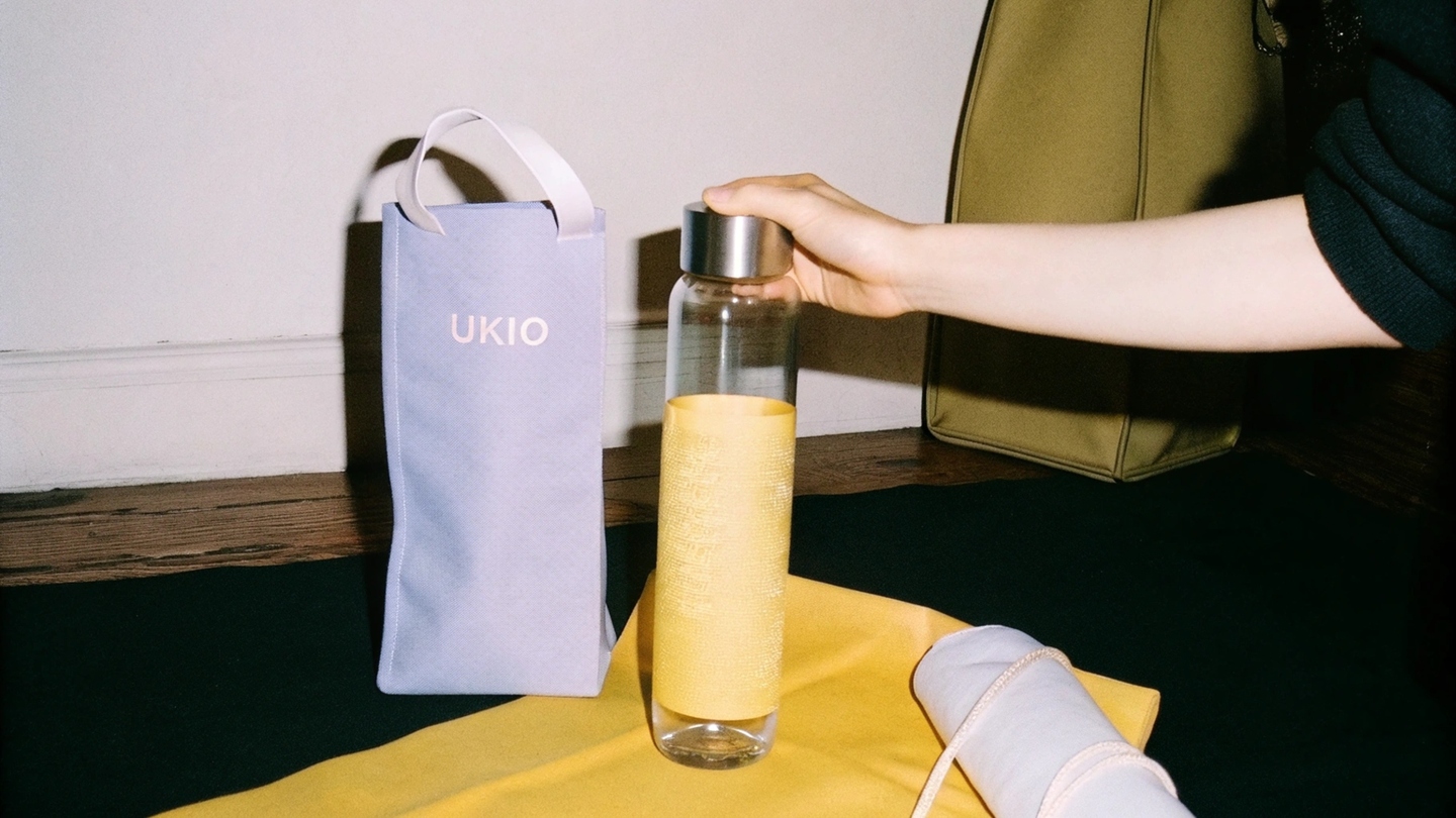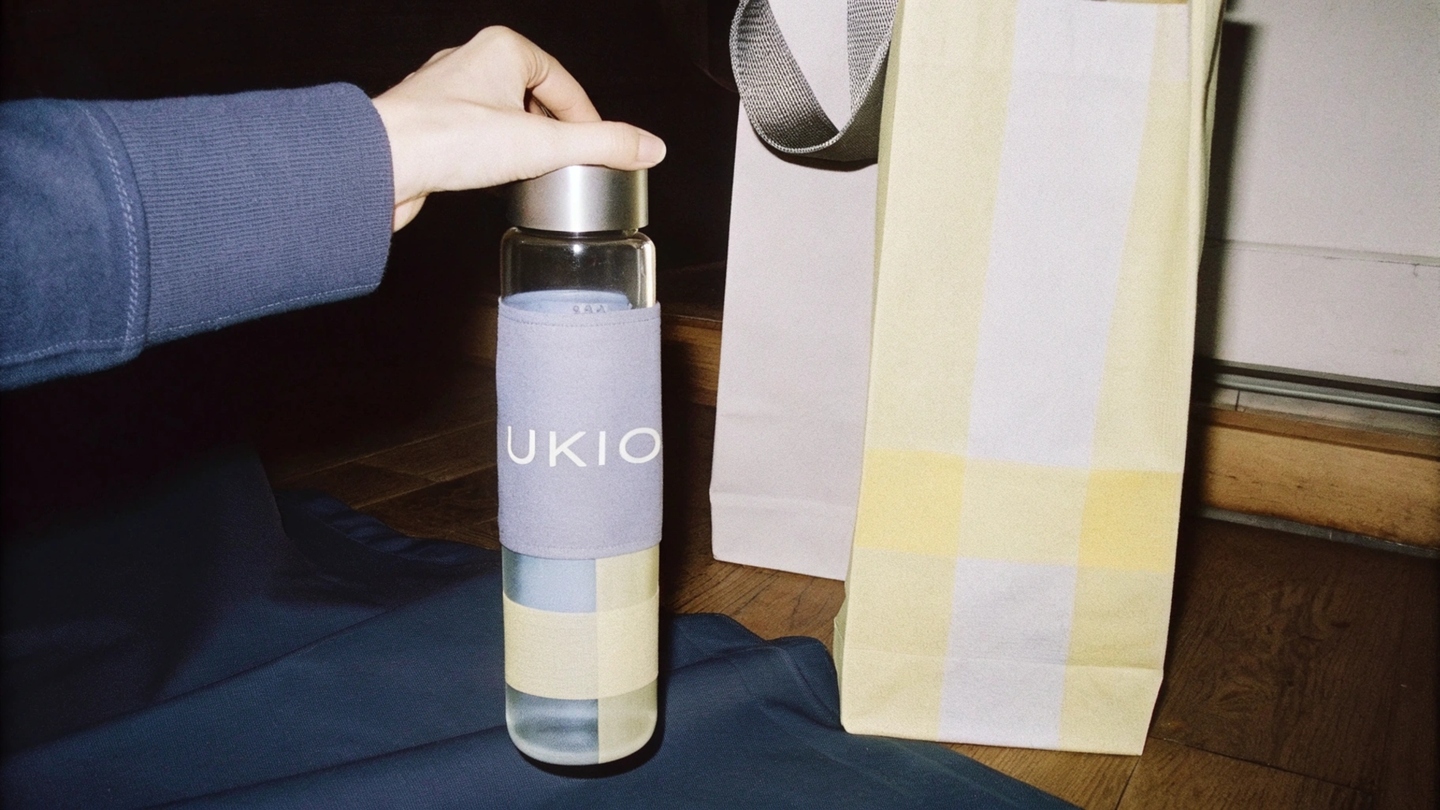 prompt: Create an image of a person placing a sleek UKIO-branded glass water bottle into a premium UKIO paper bag. The bag and bottle both feature the UKIO logo and soft colors (purple, yellow, blue, neutral tones). Highlight the minimalist, modern design and eco-friendly feel of the products.
