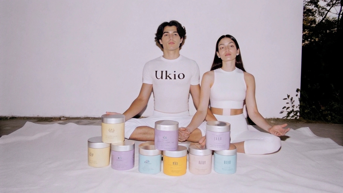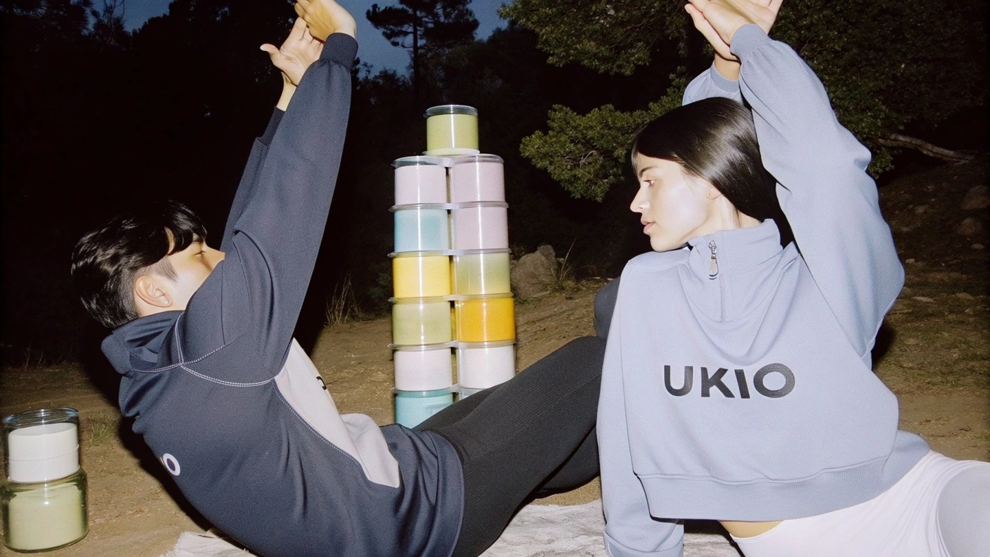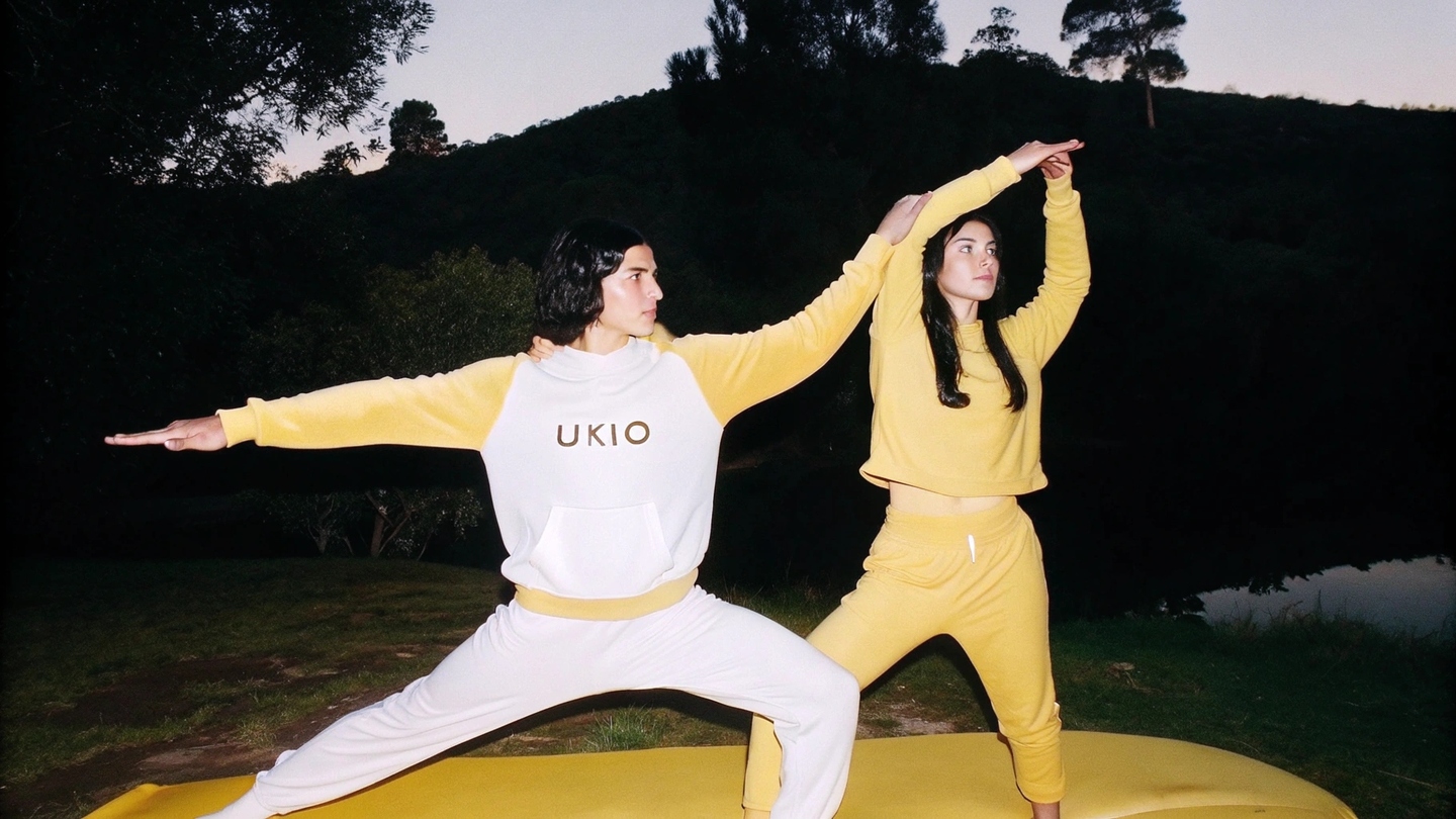 Prompt: Create an image of a yung man and young woman practicing yoga in nature outdoors in loth for sport with UKIO\slogo on them. Their faces are relaxed and happy. Show the modular stackable, interlocking glass jars in soft wheels (purple, yellow, blue, neutral tones) armed neatly built, highlighting their unique identity and strength to be sesembled into creative cases. Include the minimumist packaging with the `UKIO' logo and Branding devices. Capture a Kalm, Harmonious atmosphere with natural light, highlighting the conflict between wellness, Mindfulness, and the UKIO brand.