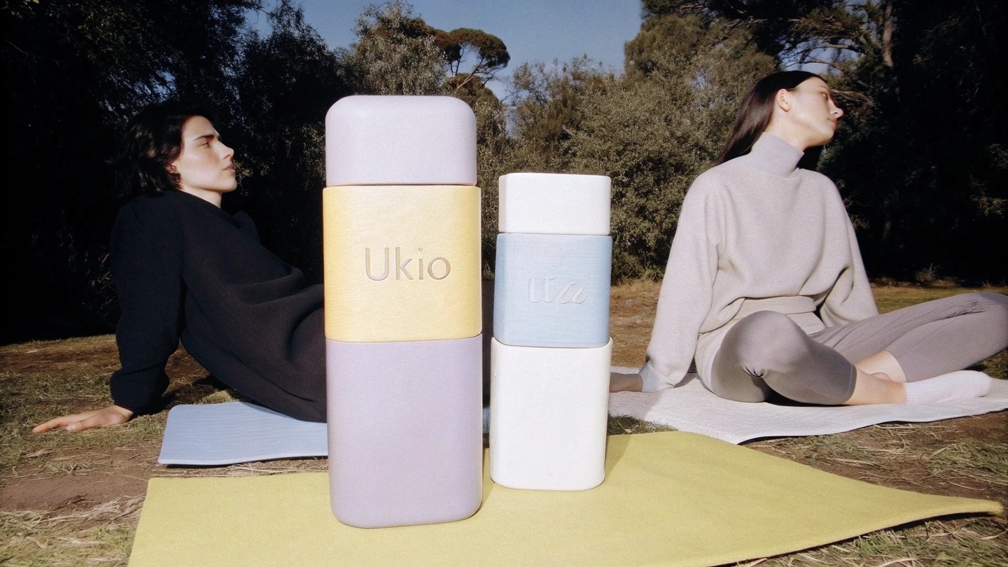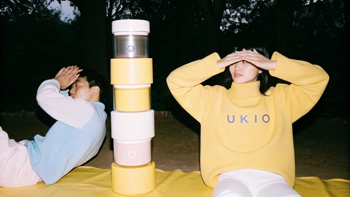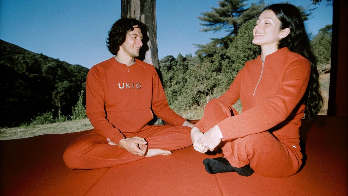 Prompt: Create an image of a yung man and young woman practicing yoga in nature outdoors in loth for sport with UKIO\slogo on them. Their faces are relaxed and happy. Show the modular stackable, interlocking glass jars in soft wheels (purple, yellow, blue, neutral tones) armed neatly built, highlighting their unique identity and strength to be sesembled into creative cases. Include the minimumist packaging with the `UKIO' logo and Branding devices. Capture a Kalm, Harmonious atmosphere with natural light, highlighting the conflict between wellness, Mindfulness, and the UKIO brand.