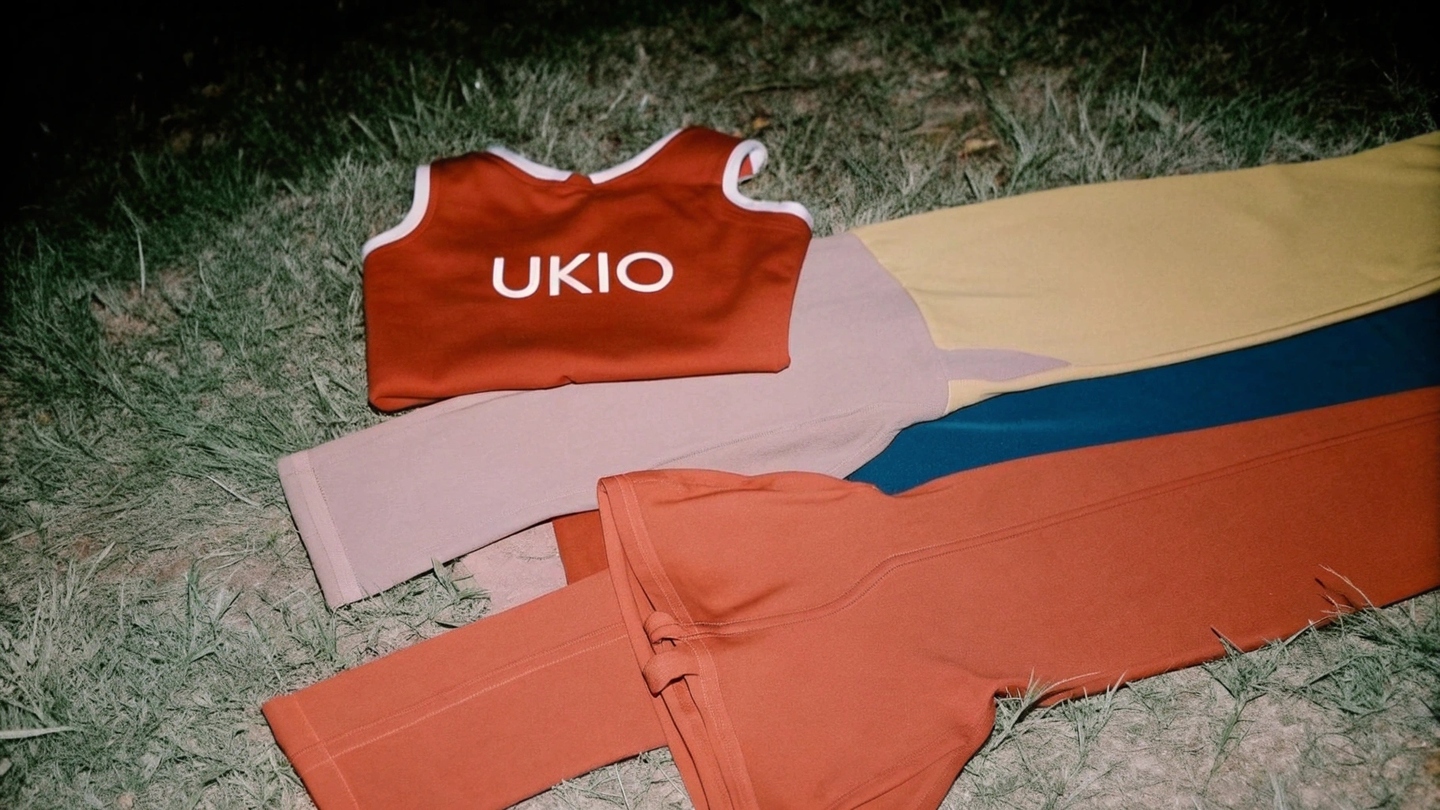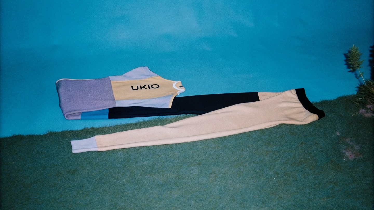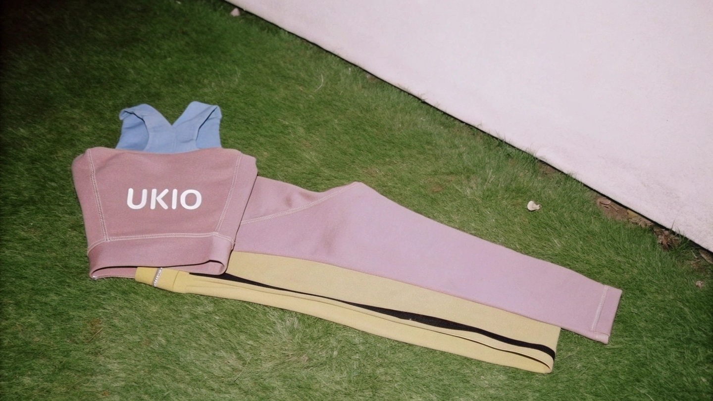 Prompt: Create a definition of UKIO portswire (leggings and a report top) with the UKIO log, using the brand\s soft collor palette (purple, yellow, blue, neutral tones). Place the grounding on nationality in a natural outdoor setting, giving a minimumist, premium look with out incorporating a person. clothes are not put on a person, the just Lie here cloth on a grass separate from each other