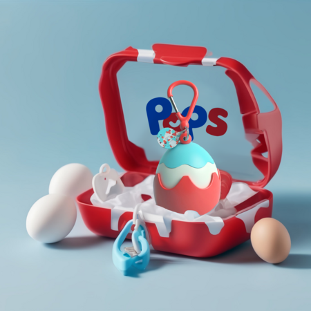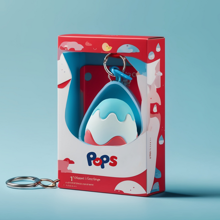 Нейроплод: photo of product box with simple cute vector signs on the white box, inside which are cute children’s rubber toy keychain in the form of an egg with a plastic carabiner on top in redm blue and white colors. Mockup photography realistic on light blue background