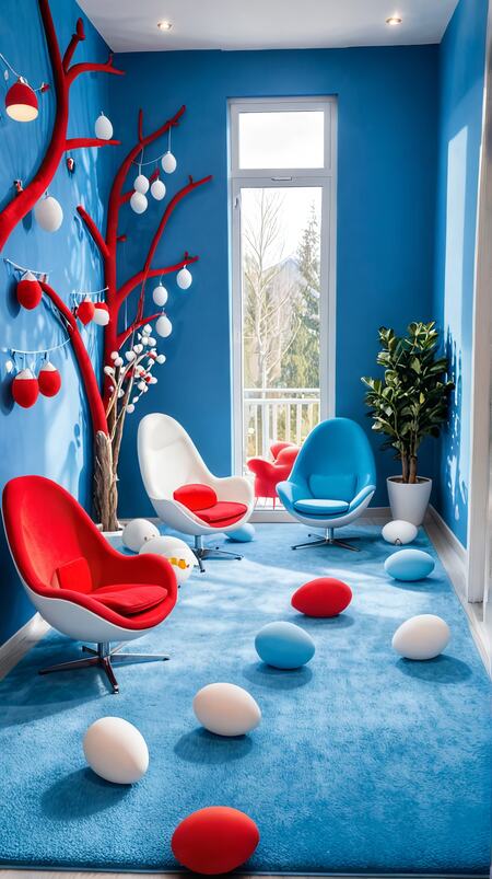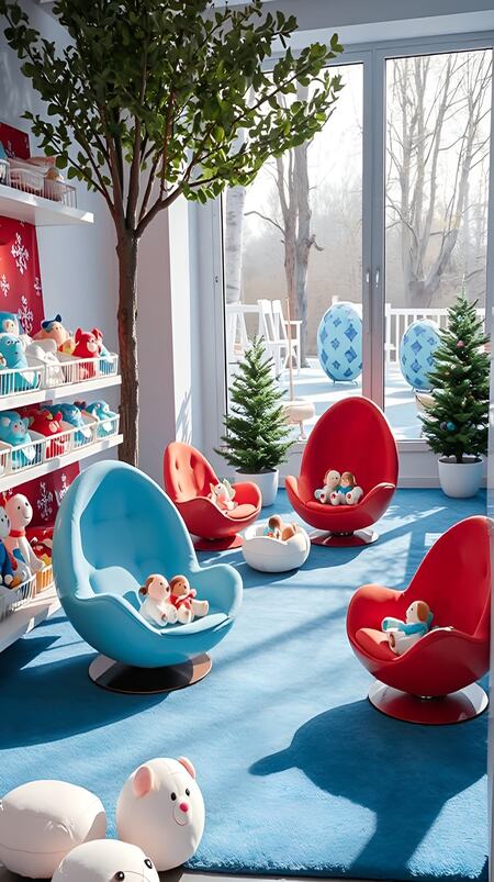 Нейроплод: interior of a shop for kids, fluffy blue carpets with beautiful rubber toys in the shape of eggs and soft fluffy chairs in the shape of eggs, in red, blue and white colors soft cozy lighting, sun rays, trees around, peaceful atmosphere