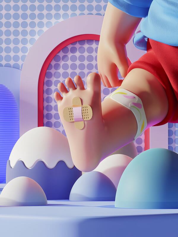 Ideogram: Lively and colorful poster showing an adorable baby’s foot, with a band-aid attached. The baby is dressed in blue and red clothes. The background is a unique combination of a simple pattern and eggs combined with simple 3D graphics and soft lighting in red, blue and white tones. The overall design showcases a Japanese aesthetic inspired by Nintendo.