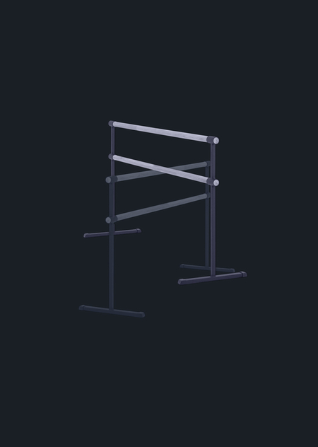 Танцкласс с балетными станками. Гамма спектакля — черно-белая, с синими оттенками.