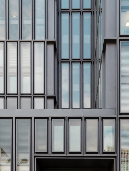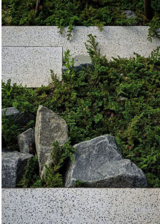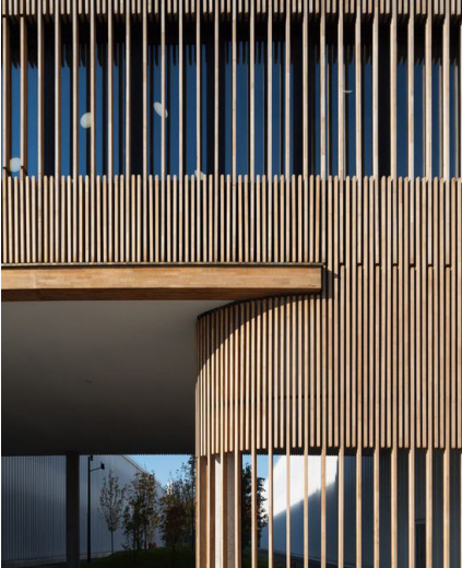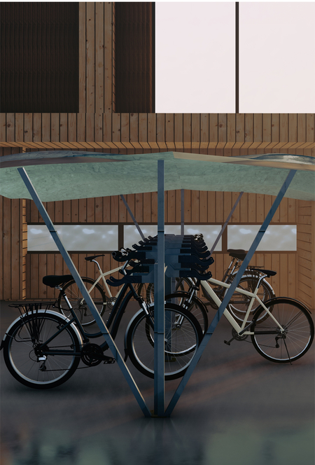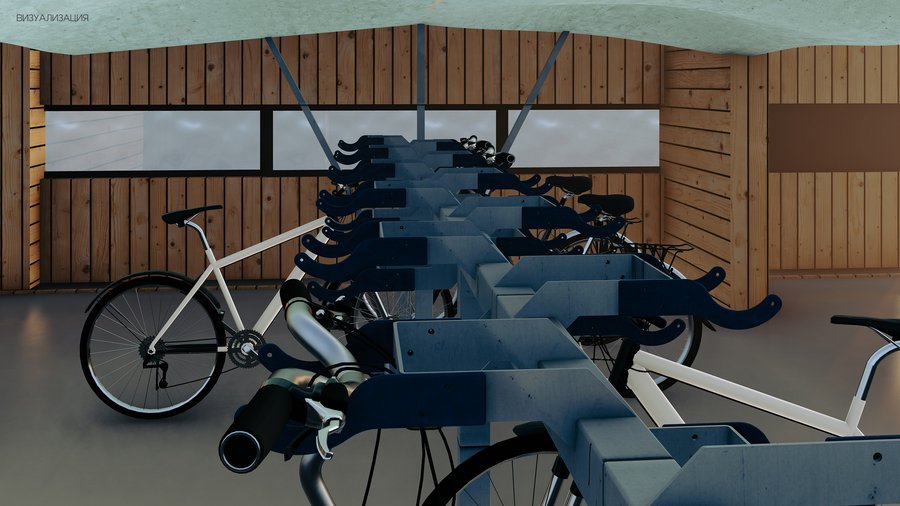 Велопарковка соответствует архитектурному облику жилого комплекса: она выполнена в оттенках, напоминающих о северном море и природе северных широт, её линии плавные и функциональные.