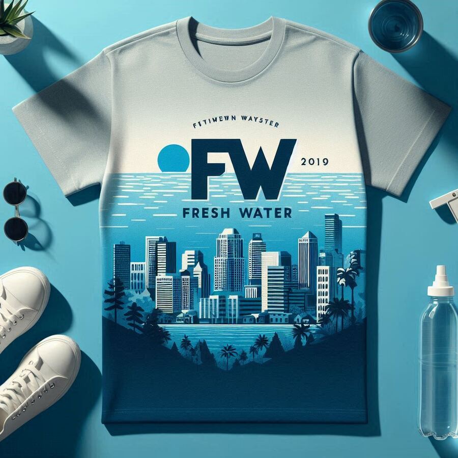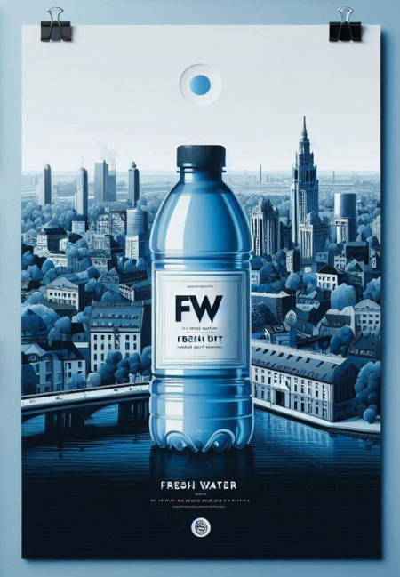 Примеры использованных промптов: Glass bottle, bottle labeled fresh water brand, label has a flat city drawn on it, blank background, blue color scheme Office, office under the brand of fresh water, the main idea of the brand is traveling, there is a chair and tables in the foreground, there are vegetation Poster, on the poster a bottle with a fresh water brand label, the label has a city painted on it, blue color scheme, the poster has a city painted on it T-shirt, on the T-shirt the fresh water brand, on the T-shirt the city is drawn flat, empty background, blue sca