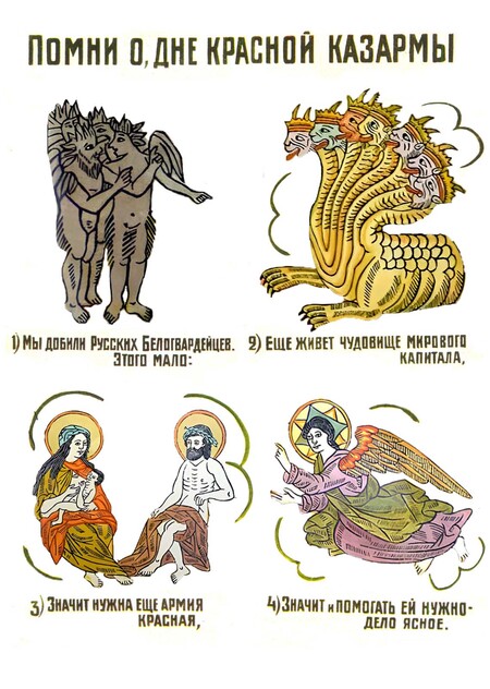 Главная коммуникативная задача как художников «Окон РОСТА», так и автора Библии для неграмотных — донести свои идеи простым и понятным большинству визуальным языком. Здесь пародоксально породнились две непримиримые между собой идеи — христианство и «лозунговая» советская идеология. В каждом из этих случаев художники-создатели, движимые разными по своей сути идеями, так или иначе обращаются к традициям русского лубка, возвращаясь к истокам, чтобы стать ближе к народному сознанию и воздействовать на него, передавать нужные идеи.