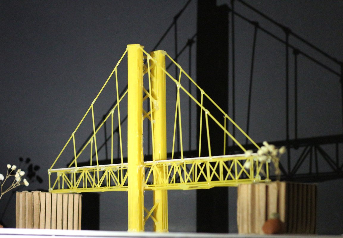 Проект представляет собой создание конструкции моста, где основным материалом выступают сухие спагетти. Цель — с помощью ферменной конструкции и инженерного расчета продемонстрировать, как хрупкий материал может превратиться в устойчивую структуру. Форма вдохновлена известными архитектурными решениями. Это наглядный пример того, как точность сборки и продуманность дизайна преодолевают ограничения материала.