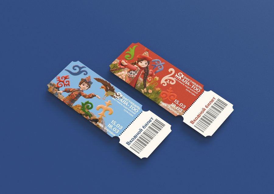 Модель: Recraft Промпт: realistic 3D mockups of tickets for a Kyrgyz cultural festival; elegant design featuring traditional Kyrgyz ornaments and ethnic patterns integrated into the layout; color palette of beige, red, green, and blue in slightly dark shades; tickets displayed as physical objects on a textured surface (such as wood or fabric) with realistic lighting and soft shadows; professional modern composition suitable for branding and presentation; detailed close-up view showing high-quality print, textures, and embossed ethnic details; realistic 3D rendering, warm and authentic cultural aesthetic
