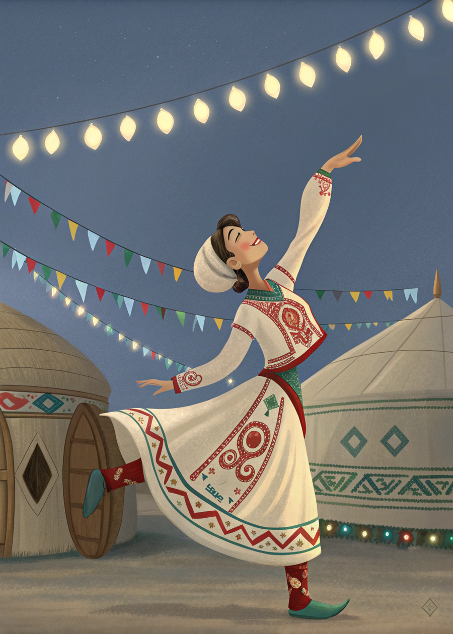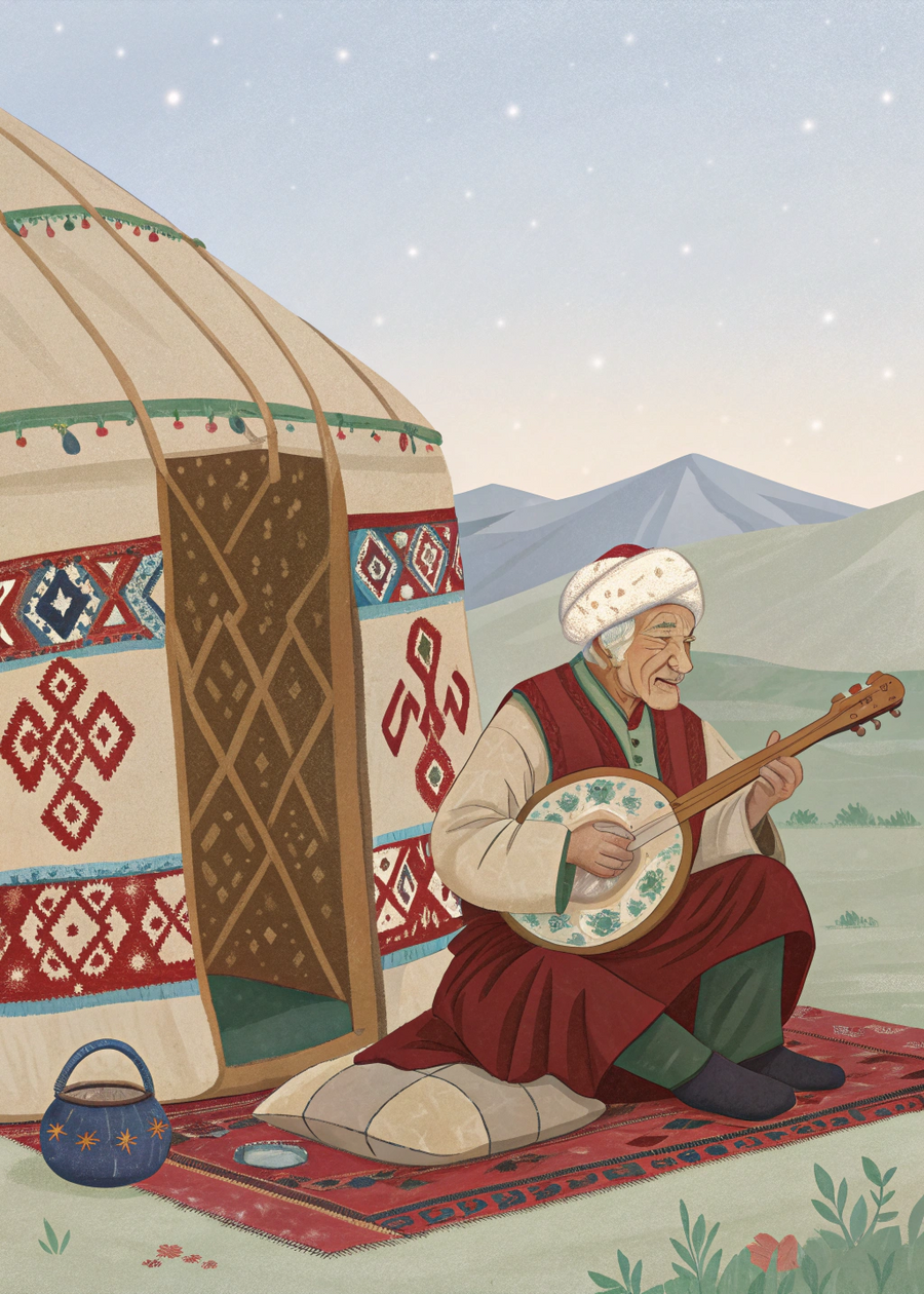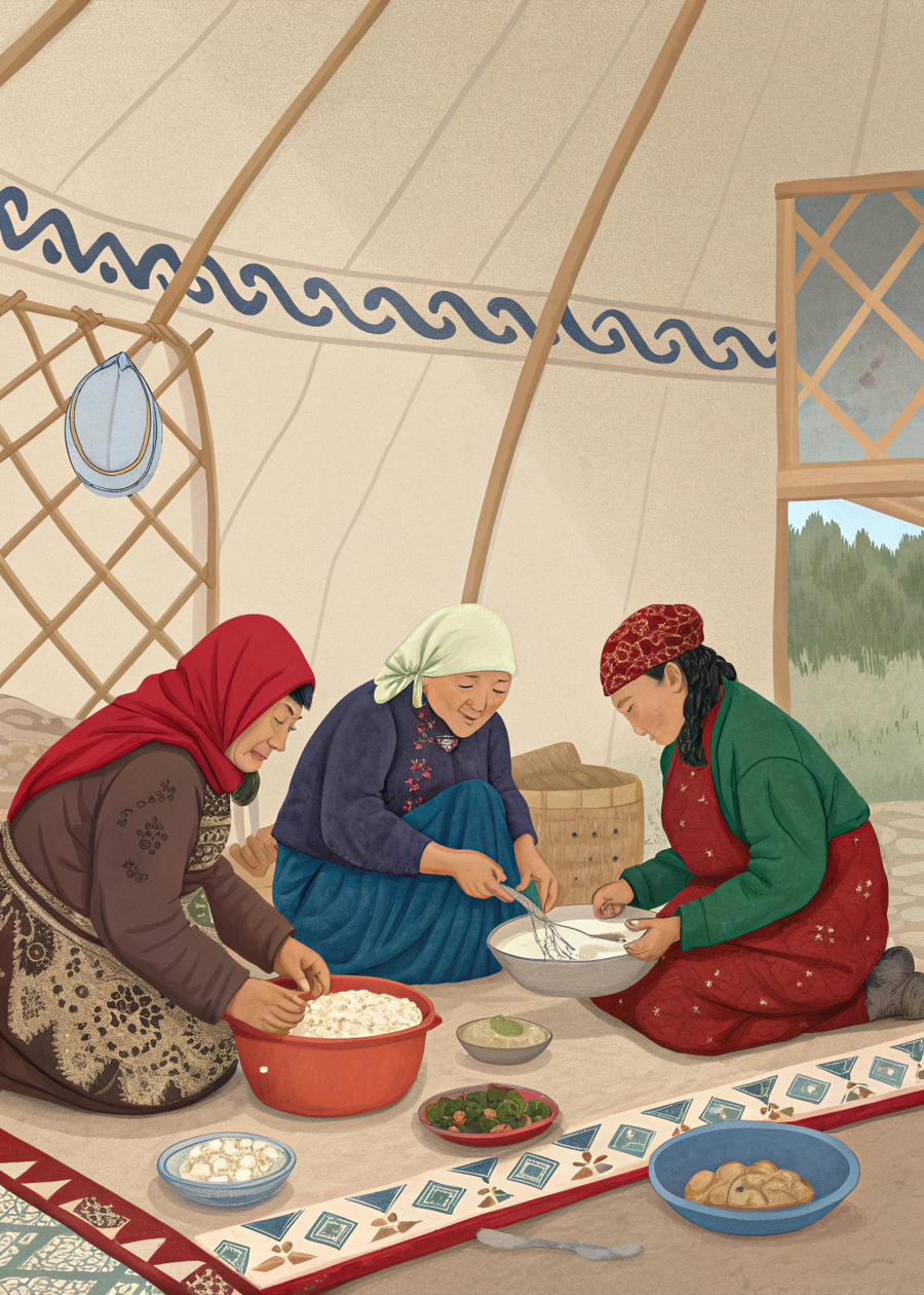 Модель: Recraft Промпт: 1. a poster depicting Kyrgyz grandmothers inside a yurt preparing traditional food together; cozy warm atmosphere with soft natural light entering through the yurt’s opening; visible traditional utensils, fabrics, and patterns; color palette of beige, red, green, and blue in slightly dark shades; detailed stylized 3D scene evoking tradition, warmth, and community. 2. a 3D poster of a young Kyrgyz girl dancing gracefully in traditional national costume with ethnic patterns and ornaments; expressive movement and dynamic lighting; background showing the festival area with yurts and flags; color palette of beige, red, green, and blue in slightly dark shades; vibrant yet elegant 3D illustration for a cultural festival poster. 3. a detailed poster illustration of an elderly Kyrgyz man wearing traditional national clothing, sitting near a yurt and playing the komuz; calm, cultural atmosphere with ethnic patterns on fabrics and decorations; background includes soft steppe scenery and subtle lighting; color palette of beige, red, green, and blue in slightly dark shades; realistic 3D stylized artwork suitable for a cultural festival poster