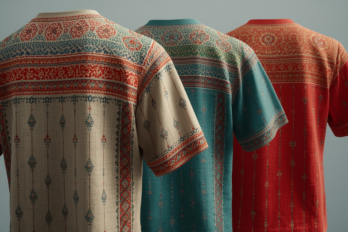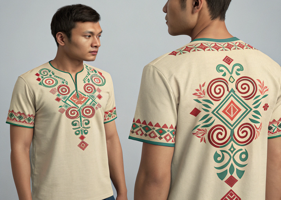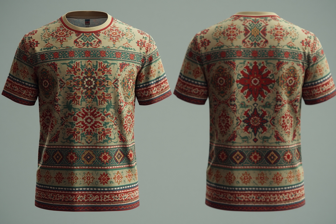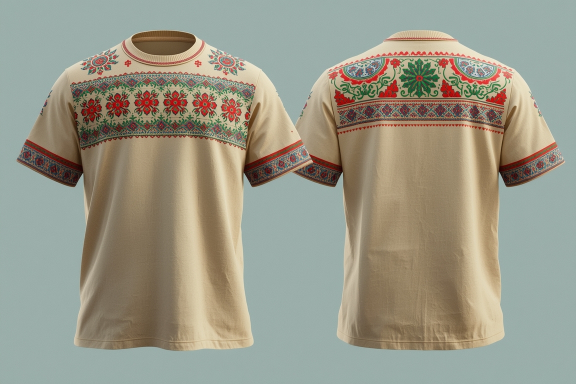 Модель: Leonardo AI Промпт: A set of modern T-shirts featuring traditional Kyrgyz patterns and ornaments, intricate geometric and floral designs, vibrant colors inspired by Kyrgyz culture, high-quality fabric texture visible, realistic 3D rendering, front and back view, on a neutral background, showcase of cultural style with contemporary fashion appeal, detailed and elegant embroidery-like patterns, symmetrical and harmonious composition, photorealistic lighting and shadows.