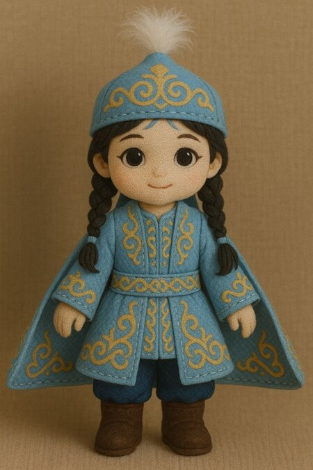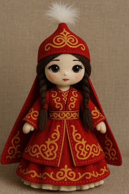 Модель: Chat GPT 5 Промпт: highly realistic 3D-rendered Kyrgyz dolls representing young girls dressed in traditional national clothing with detailed ethnic patterns, embroidery, and accessories; each doll has a warm handcrafted look with realistic fabric textures and soft lighting; include small realistic model yurts decorated with Kyrgyz ornaments and patterns; color palette of beige, red, green, and blue in slightly dark shades; authentic cultural design aesthetic with attention to traditional details; realistic 3D product mockups suitable for cultural merchandise or festival display