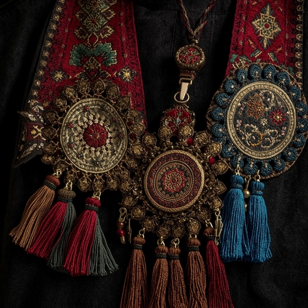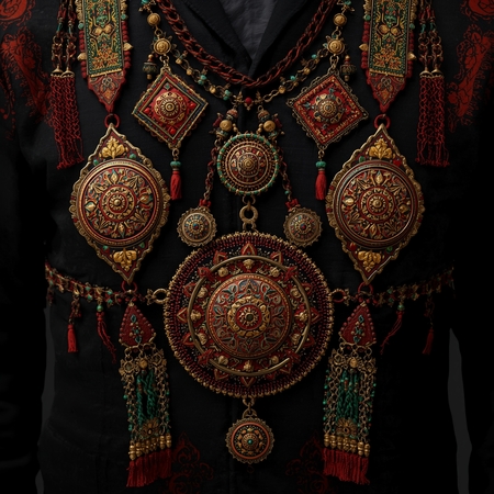 Модель: Leonardo AI Промпт: Realistic decorations with intricate traditional patterns and ornaments, worn around the neck on a decorative strap or ribbon, originating from the vibrant festival of Kyrgyz culture, featuring a dominant color scheme of dark red, with accents of deep green, earthy beige, and sky blue, showcasing the unique cultural heritage and symbolism of the region, with possibly some golden or metallic elements to add a sense of luxury and festivity, and adorned with meaningful motifs that reflect the history and identity of the Kyrgyz people.