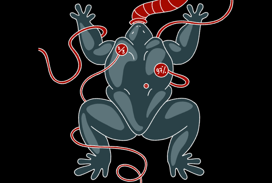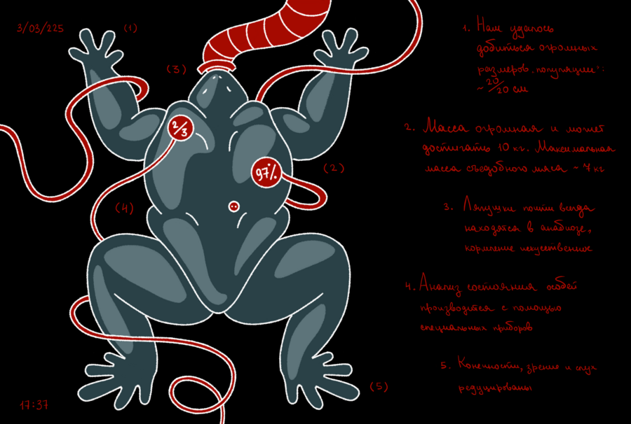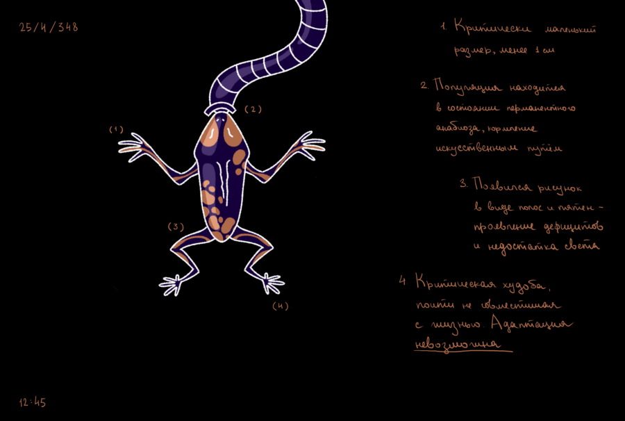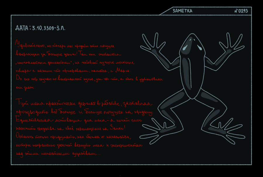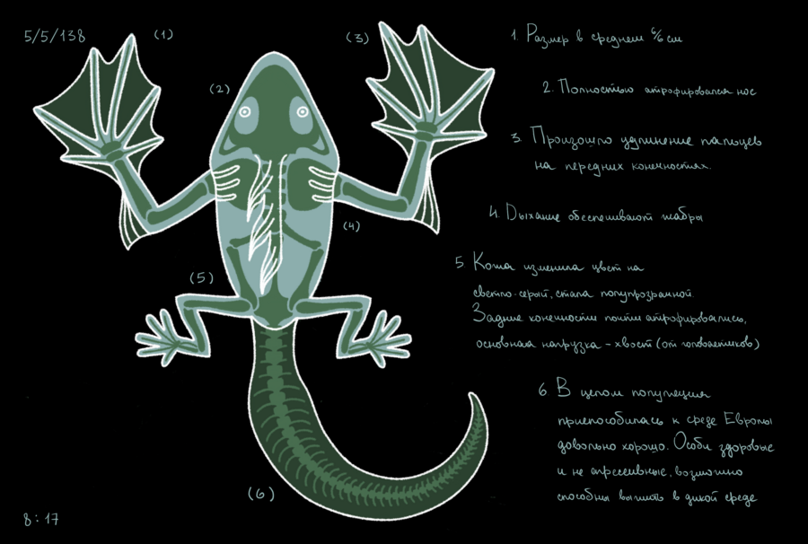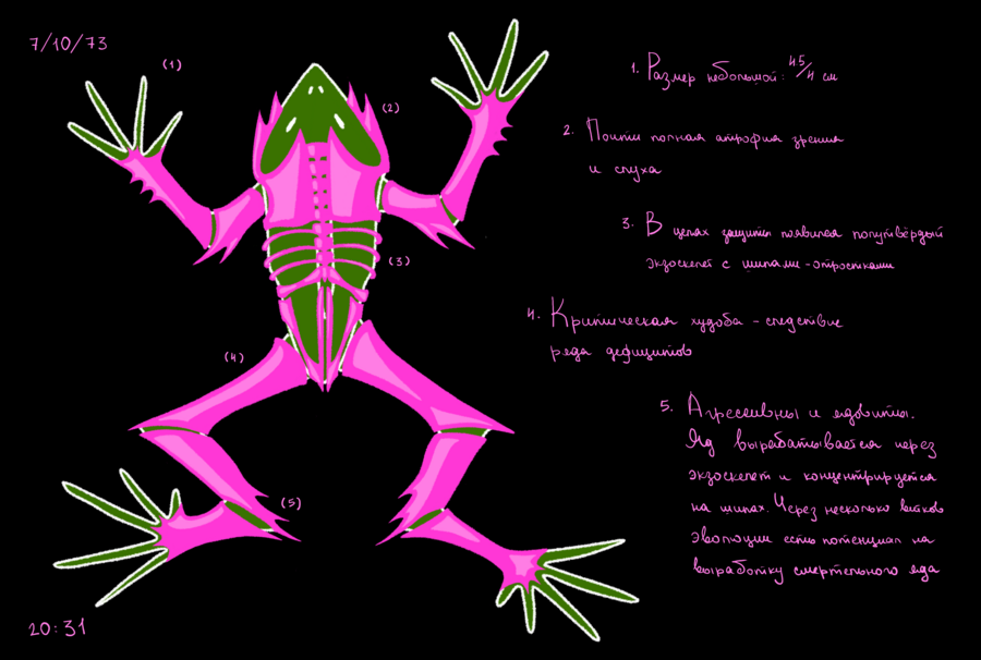 На Венере мне выделили совсем немного пространства под лаборатории. Лягушек пришлось содержать в тесных контейнерах, и охладители на моем этаже работают не так хорошо, как хотелось бы — это все отразилось на процессе эволюции. Чтобы выжить в тесном пространстве и не быть раздавленными собратьями, особи отрастили себе что-то наподобие экзоскелета, защищающего нежную кожу. Органы чувств практически атрофировались, в подобной среде в них просто нет смысла, зато им на смену пришли шипы и когти. Подопытные стали агрессивными и научились вырабатывать слабый яд.