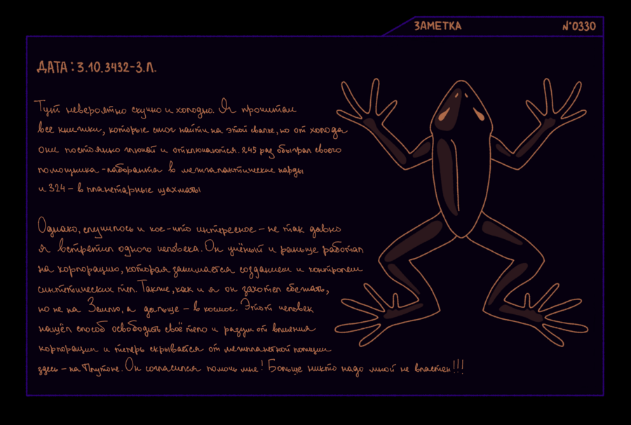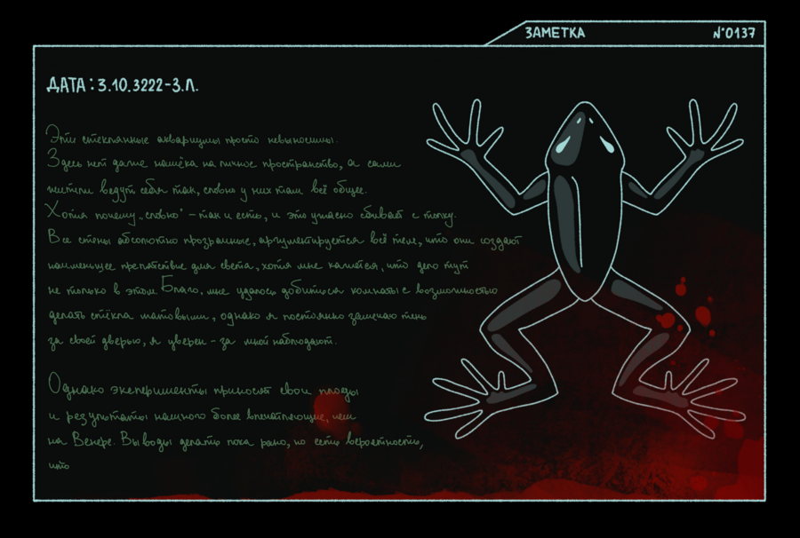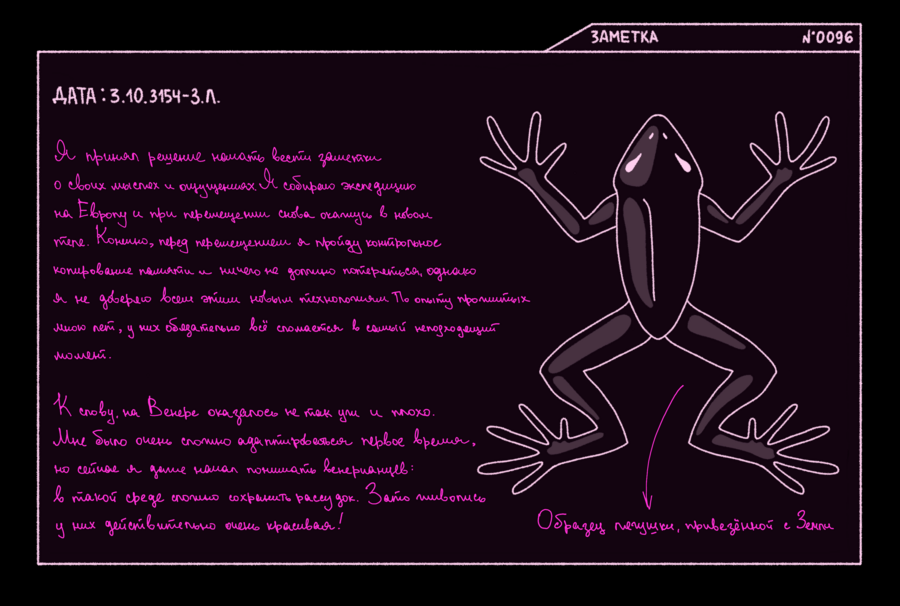 Я не верил, что это действительно сработает, но теперь я на Венере. У меня есть совсем немного времени, чтобы освоиться в моей новой лаборатории и изучить материалы о планете — через 35 часов прибудет лайнер с подопытными лягушками, находящимися в анабиозе. Мне предстоит изучать их адаптацию в новой среде, следить за изменениями и появлением новых генов, ответственных за адаптацию. Основная цель моей работы — понять, как лягушки смогут приспособиться к новой среде. И, возможно, нам удастся применить эти знания к человеческому организму. Удивительно, что после моей смерти ученые смогли придумать способ погружать земноводных в анабиоз на столь долгий срок, что они могут спокойно вынести перелет с Земли на Венеру. Этим занимается какая-то транспортная компания межпланетных перелетов «ASTRUM LOGISTICS». Во времена моей прошлой жизни (с точки зрения биологического тела, разумеется), такое было возможно только в фантастических фильмах, а сейчас я вижу прогресс собственными глазами…