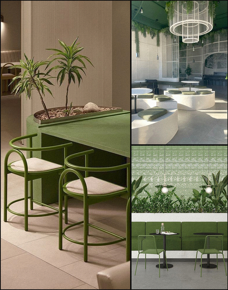 Мебель мягкая, округлая, с обволакивающей формой и комфортом лаунж-зоны. Предметы не кричат, но обладают характером — от диванов в насыщенном зелёном до минималистичных столиков из дерева и бетона.
