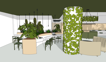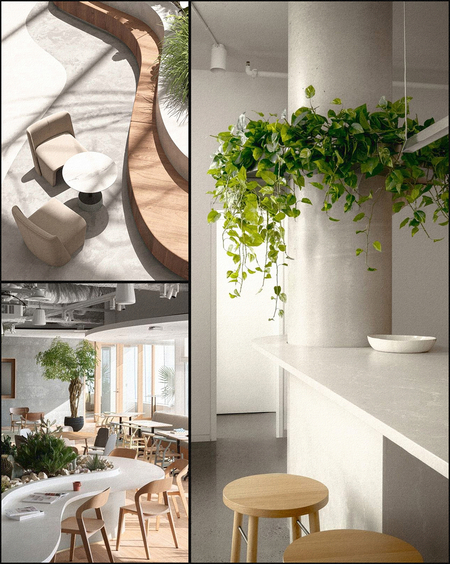 Спокойное и вдохновляющее пространство, наполненное ощущением осознанности и связи с природой. Здесь легко дышится и легко думается, что создаёт условия для глубокой работы, творчества и восстановления ресурса. Интерьер формирует ощущение гармонии и внутреннего баланса: отсутствует формальная офисная динамика, присутствует только мягкая энергия, концентрация и комфорт. Свет, растения и текстуры работают в тандеме, усиливая чувство уюта и природной естественности.