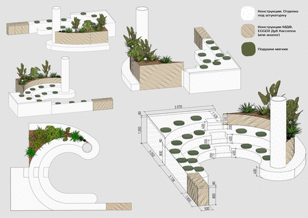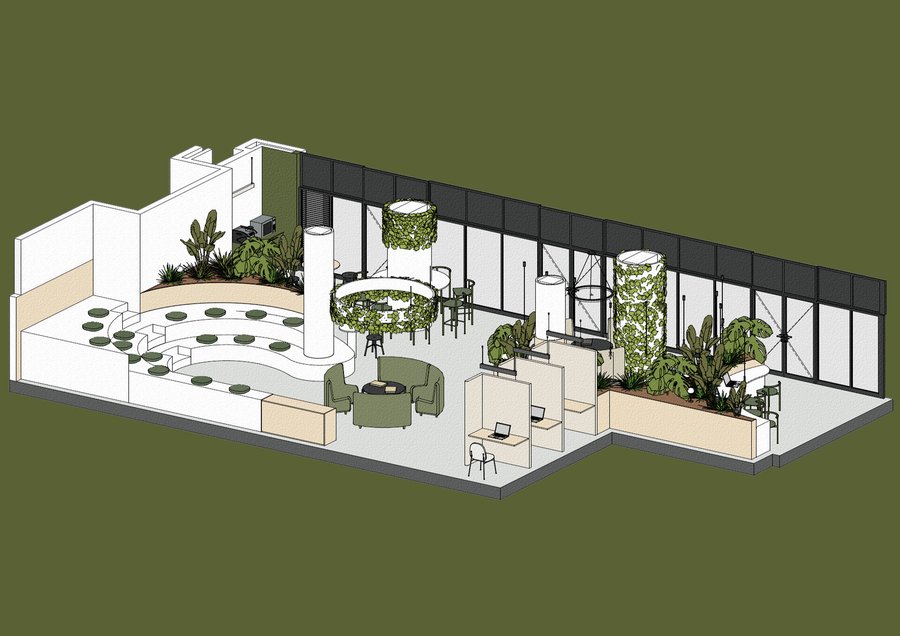 Главный центр интерьера — острова растений, дополненные сценографией света, а также подвесные зелёные композиции с потолка. Это сердце пространства, где концентрируются внимание и эмоции гостей: растения здесь становятся не просто декором, а символом философии коворкинга — связи с природой, гармонии и мягкой энергии. Композиция запоминается, её фотографируют и к ней возвращаются, она формирует визуальную и смысловую ДНК всего пространства.