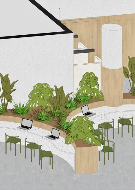 Философия коворкинга обращена к тем, кто ценит красоту в деталях, чистоту среды и уважительное отношение к процессу работы. Материалы и предметы поддерживают баланс между природностью, эстетикой и функциональностью. Здесь можно работать, отдыхать, общаться и вдохновляться — словно находясь в современном природном ретрите посреди города.