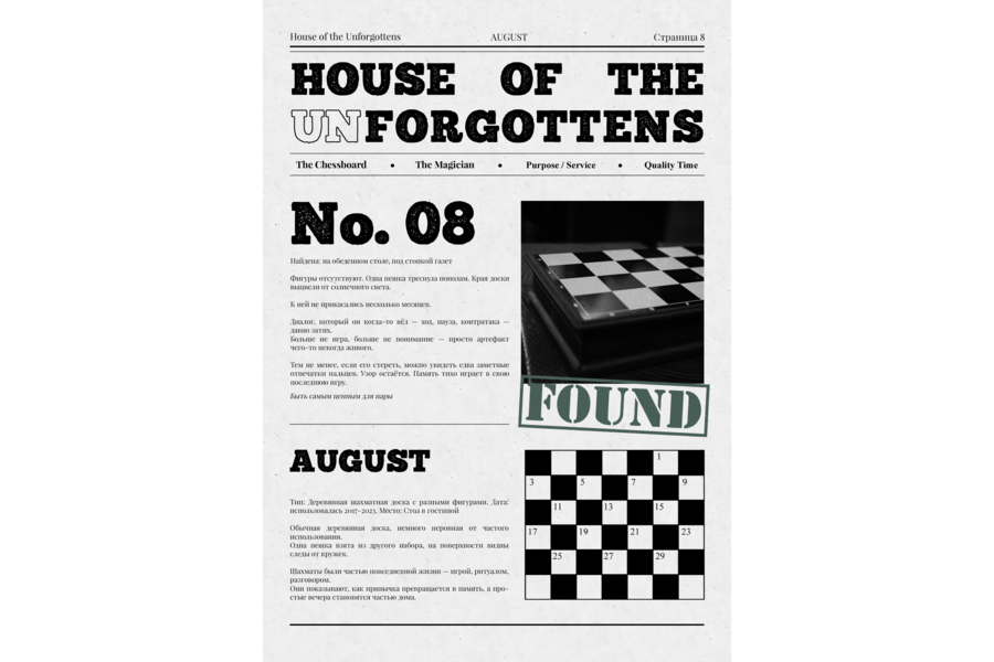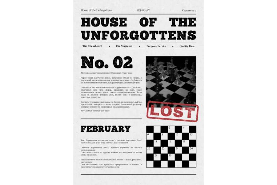 These are quiet reflections on time, loss, and the mundane traces of love. Told through the lens of a year dedicated to lost and found objects, it transforms the mundane—a photo frame, a chessboard, a pair of shoes—into vessels of memory. The work begins with hope: the loss of a lost object carries with it the belief that it still exists somewhere, fulfilling its purpose in another life. But over the course of several months, what emerges is no restoration of change. The frame remains empty, the chessboard unused, the ring hidden. These discoveries demonstrate that time does not return what it takes; it only changes.