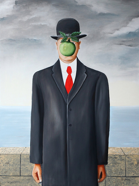 слева направо: Hipgnosis, оформление пластинки «Wish You Were Here», Pink Floyd, 1975; Рене Магритт, «Сын человеческий», 1964