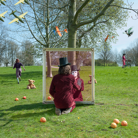В каком-то смысле можно рассматривать эту обложку, как продолжение сюжета Рене Магритта — все тревожные мысли вылетают из заточения и человек становится свободным.