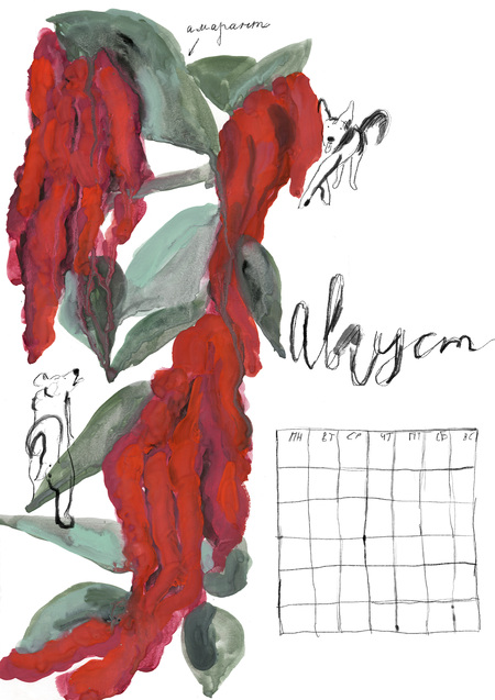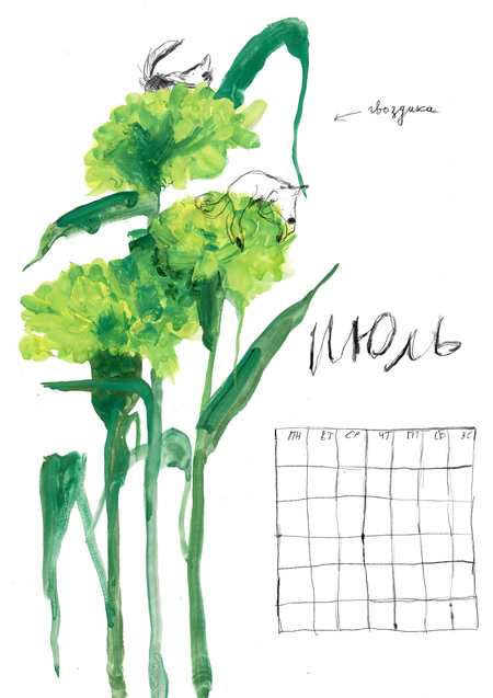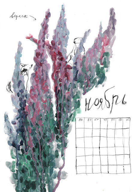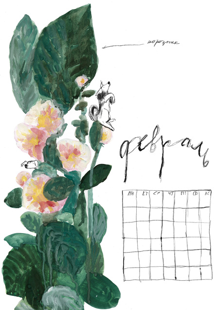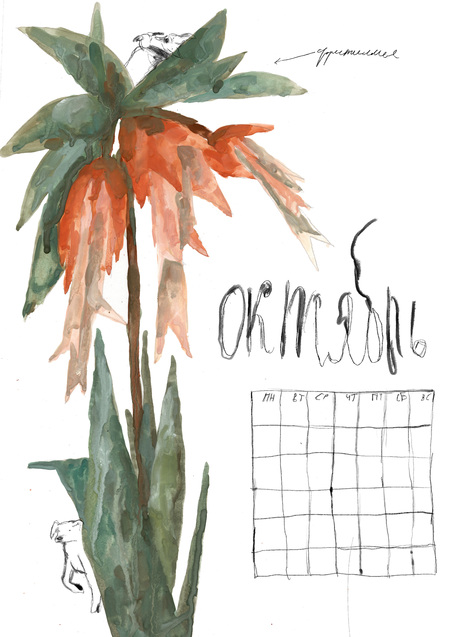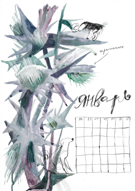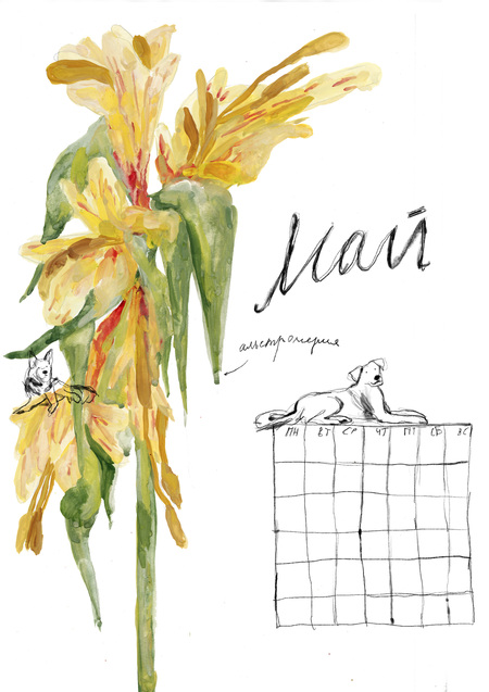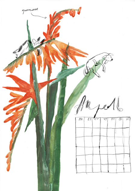Наличие собак делает неотъемлемой частью жизни ежедневные длительные прогулки. Данный календарь посвящен именно этим регулярным мини-путешествиям. Смену сезонов в нем символизируют цветы, обозначающие каждый из двенадцати месяцев. А гидами по календарной «оранжерее» выступают собаки автора — Стёпа и Кубрик.